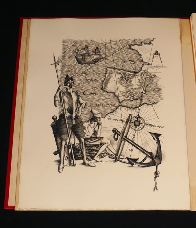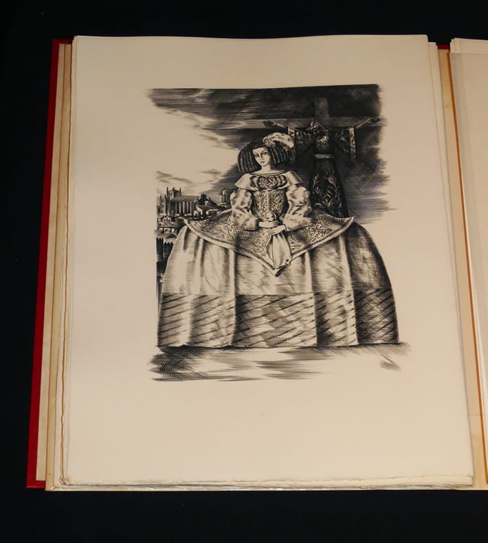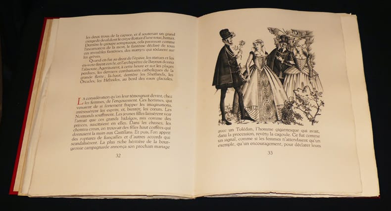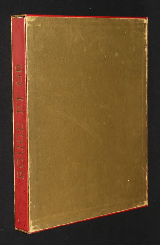 LA VARENDE Jean deRouge et Or - Nouvelles espagnoles.Paris, Marcel Lubineau, 1951, in folio, en feuille, sous couverture rempliée, sous étui rouge et emboitage or (frotté quelque peu), 23 Gravures au burin de Camille-Paul Josso (1902-1986). -Édition tirée à 415 exemplaires sur vélin d'Arches, celui-ci le n°1371) Peau d'Espagne - XVIe siècle. - 2° Pavane pour une Infante défunte - XVIIe siècle. - 3° L'Exode de M. le Marquis de Herrera - XVIIIe siècle.Ravissant exemplaire, bien frais