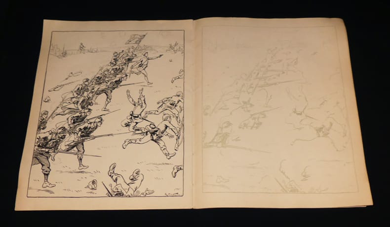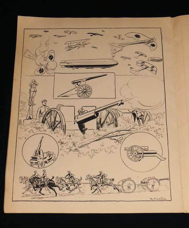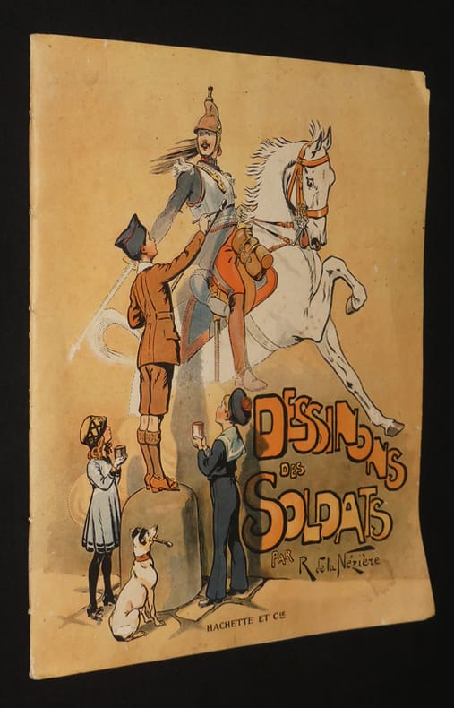 Hachette & Cie 79, Bould. Saint-Germain, Paris Broché "Un grand album (peu commun) au format petit in-folio (27,2 * 34.4 cm), couverture illustrée, 20 pages de dessins, d'exemples et de pages pour s'entraîner à dessiner des soldats. En deuxième de couverture on trouve ce petit texte : ""Conseils aux petits dessinateurs : nous conseillons aux petits dessinateurs pour qui cet album a été composé de commencer par suivre fidèlement le tracé de nos silhouettes avant de prendre l'initiative de reproduire nos modèles sur une feuille à part. Il sera bon en effet, qu'ils fassent cet amusant apprentissage avant de se fier à leur habilité. L'application qui leur sera nécessaire pour ne pas s'écarter de nos tracés leur rendra la main plus sûre et ils auront de meilleures chances, alors de voir le succès couronner leurs efforts."" L'album n'est pas daté, mais il fait clairement référence à la première guerre mondiale puisqu'on y voit un dogfight entre des avions allemands monoplans et biplans et des avions français. ; couverture salie, manque de papier marginale et frottement en quatrième de couverture, l'intérieur est propre, la page centrale qui est un coloriage avec un exemple a été un tout petit peu commencé (du rouge), sinon une ligne de soldats a été dessiné au crayon de bois, état correct. Livraison a domicile (La Poste) ou en Mondial Relay sur simple demande."