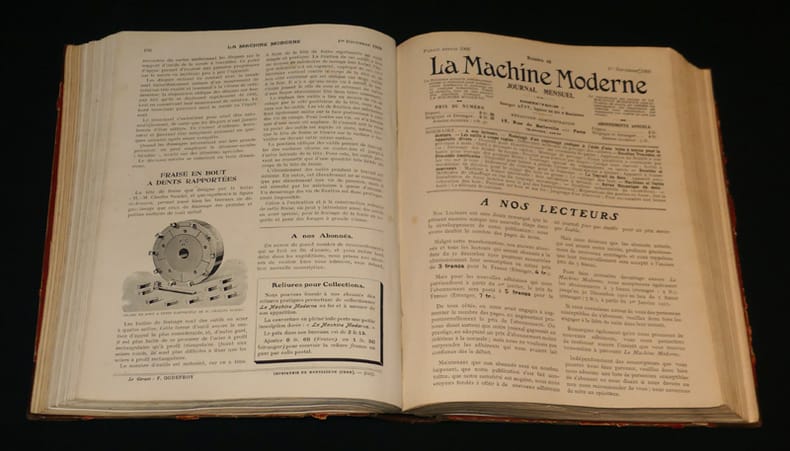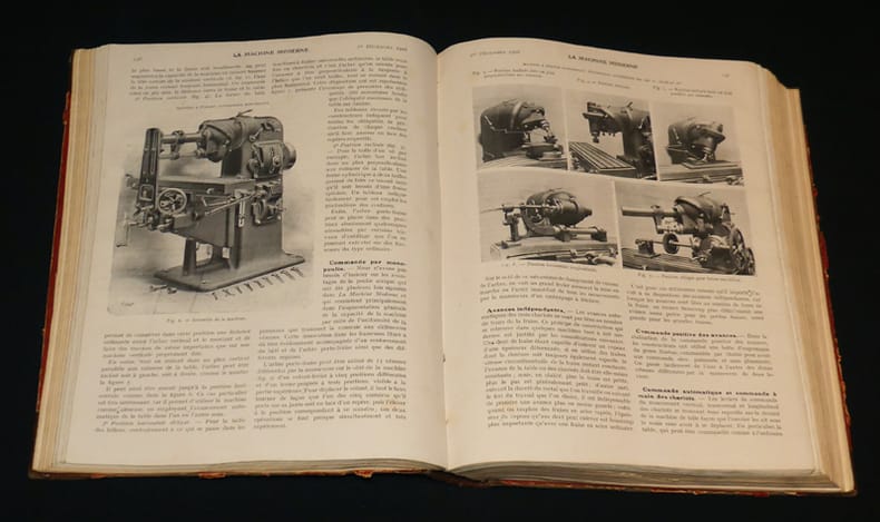 La Machine Moderne Relié 1908 RARE ENSEMBLE DE CETTE REVUE TRÈS TECHNIQUE DÉCRIVANT LES MACHINES EN USAGE À L'ÉPOQUE. Reliure comprenant du n° 14 de 1908 au n° 25 de 1908 sauf le n° 20 de juillet, puis du numéro 27 de février 1909 au numéro 37 de décembre 1909, ensuite nous trouvons dans cette reliure les numéros suivants : du n°48 de novembre 1910 au n° 66 de mai 1912. environ 20 pages par numéro sur papier glacé. Le volume fait 4.5 cm d'épaisseur. Format in-4° (20.5 * 26 cm). Très nombreux croquis techniques, plans et photographies en noir et blanc dans le texte. Revue fondée en 1906 par Georges Lévy ; reliure de travail non titrée, intérieur frais, bon état. Livraison a domicile (La Poste) ou en Mondial Relay sur simple demande.