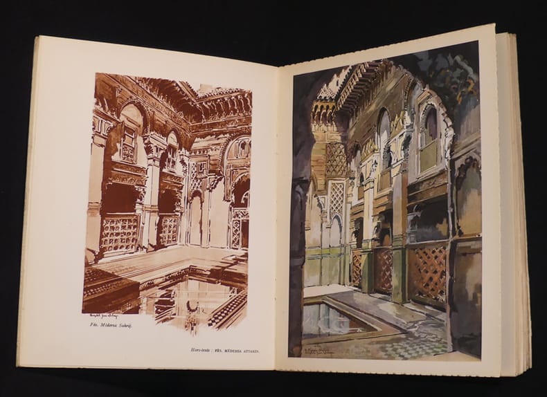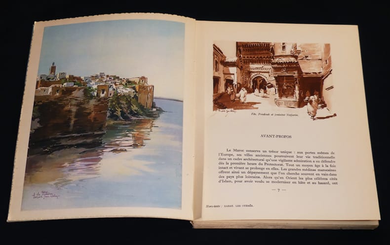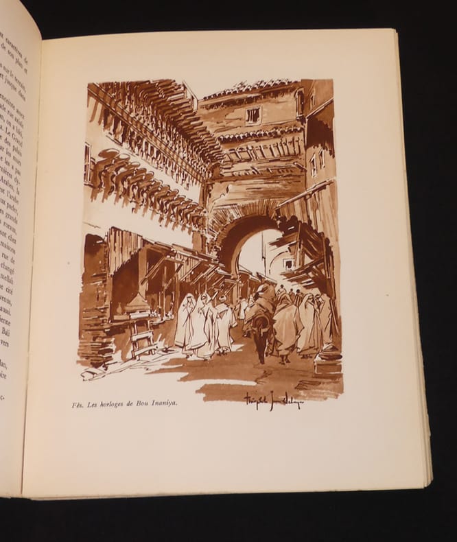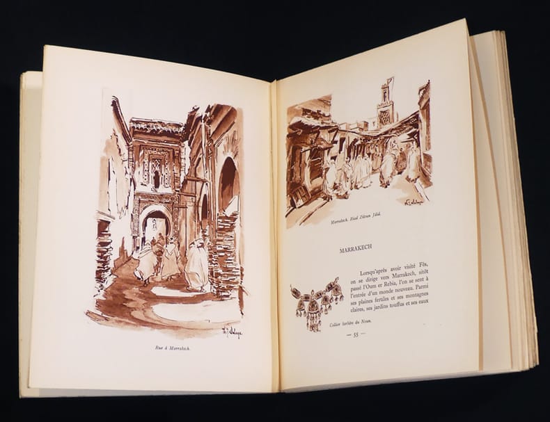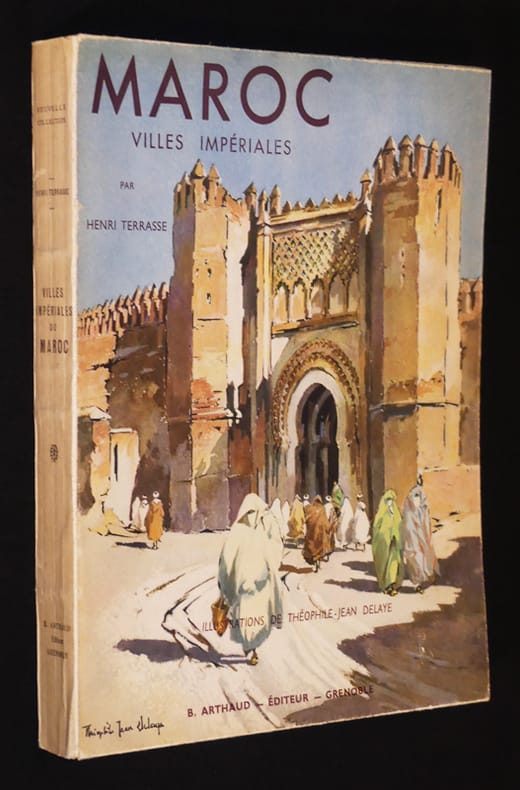 Edition originale, un des 400 exemplaires numérotés sur grand vélin pur fil à la forme BFK de Rives. Bel envoi de Théophile-jean Delaye, avec un dessin à l’encre, “A Monsieur le Docteur Charnot, ce livre sur nos grandes cités marocaines, en espérant qu’il lui servira de guide dans le dédale capricieux de nos médinas et qu’il sera pour lui, plus tard, son souvenir du Maroc. En bien sincère hommage. Théophile Jean Delaye 1938” et dessin signé de la porte d’une kasba.Originaire de la Drôme, Théophile Jean Delaye fut un des plus éminent géographe et cartographe du Maroc et un dessinateur et peintre infatigable sur sa seconde patrie qu’il a aimée passionnément.Le docteur Charnot fut lui aussi un fervent marocain et servit ce pays dans les domaines de la pharmacopée et de l’expertise judiciaire.Quelques très pâles rousseurs, bel exemplaire.