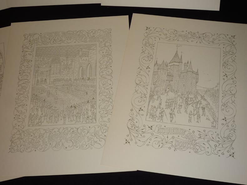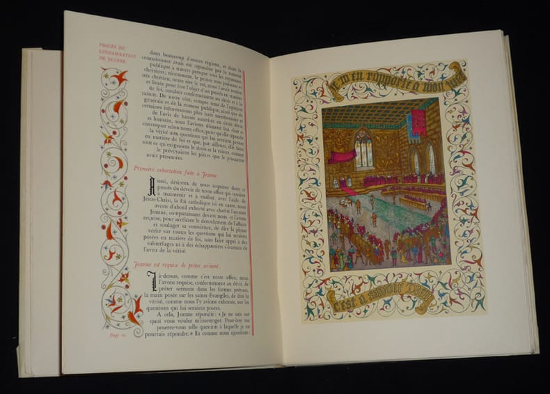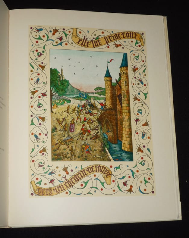 Editions André Vial, Editions de l'Odéon Broché sous chemise sous emboîtage 1962 In-4 (19,5 x 25,2 cm), broché, couverture rempliée, sous chemise en velours bleu ornée d'une pièce de titre en relief et de trois fleurs de lys au premier plat, avec un fermoir en métal, le tout sous un emboîtage cartonné, non paginé, illustrations en couleurs de André Dussarthou, 1 de 1424 exemplaires sur vélin de Renage avec une suite des illustrations en noir ; quelques traces et frottements sur l'étui carton, par ailleurs bel état. Livraison a domicile (La Poste) ou en Mondial Relay sur simple demande.