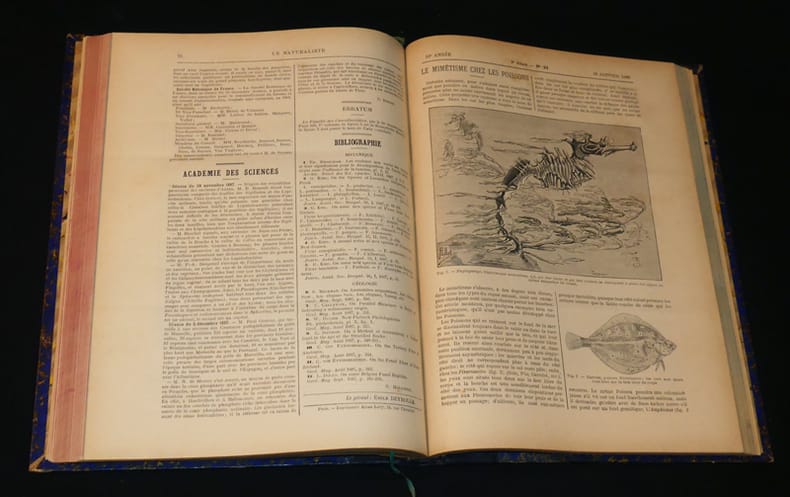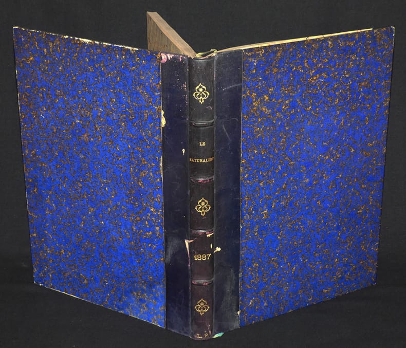 Le Naturaliste Relié 1887 "In-4 (22,7 x 30,5 cm), reliure demi-basane, 229 et 124 pages, revue ""Le Naturaliste"", du n°1 (non daté, sans doute du 15 mars 1887) au n°29 du 15 mai 1888, illustrations en noir ; quelques épidermures sur le cuir, bon état général par ailleurs. Livraison a domicile (La Poste) ou en Mondial Relay sur simple demande."