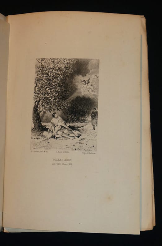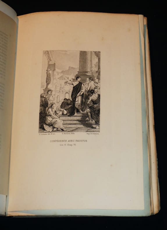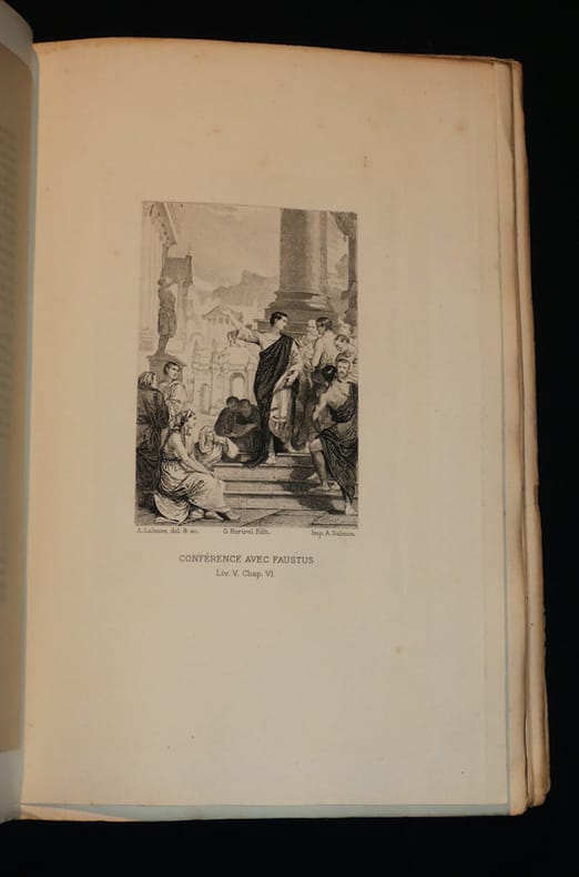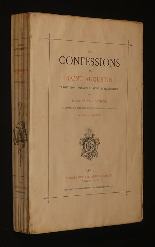 Jolie édition sortie des presses de l’imprimerie royale de la traduction préférée des Confessions de Saint Augustin. «Les Confessions avaient précédemment été traduites par Arnauld d’Andilly mais on préfère la traduction de Dubois» (Brunet, I, 561). «Ecrites au cours de l’une des périodes les plus dramatiques de l’histoire de l’humanité, les Confessions constituent la base de toute la pensée moderne. C’est une véritable épopée de la conversion chrétienne, résumée dans le drame intérieur d’un homme, drame dans lequel s’expriment tous les éléments passionnels et théoriques d’une telle expérience. Dans la littérature de tous les temps, rares sont les œuvres qui, comme celle-ci, montrent dans leur unité indissoluble, le développement d’une expérience spéculative en même temps que celui d’une expérience religieuse et humaine». (T.F. Œuvres Complètes, Vivès, 1869-1878). Superbe exemplaire, l’un des rares imprimé par l’imprimerie royale sur grand papier de Hollande, chacun des titres portant les armoiries gravées du roi Louis XV, revêtu de très élégantes reliures en maroquin vert olive à dentelle de l’époque.