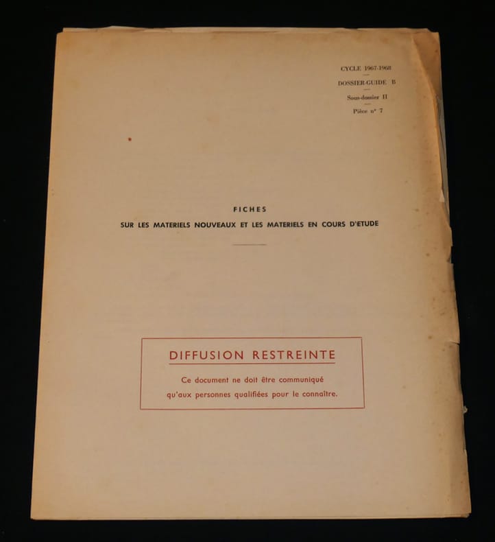 Armée de terre Dos carré collé 1967 In-4 (21x27 cm), dos carré collé, non paginé, photographies noir et blanc hors-texte et pleine-page, en supplément on ajoute des documents à diffusion restreinte (Fiche sur les matériels nouveaux et les matériels en cours d'oeuvre) ; dos frotté à la coiffe supérieure, une annotation au crayon sur le 1er plat, bon état. Livraison a domicile (La Poste) ou en Mondial Relay sur simple demande.
