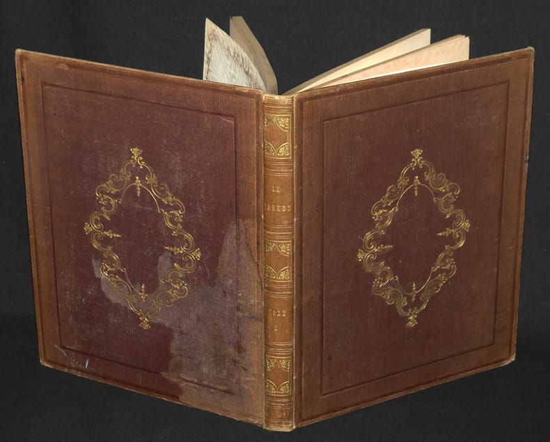Paris, H. Mandeville, 1849. "21 x 27, 68 pp., 32 planches gravées sur acier, reliure pleine toile (cartonnage), plat avant et arrière ornés d'un grand motif doré, trois tranches dorées, bon état (quelques rares rousseurs; dos frotté; pied, coiffe et coins émoussés)."