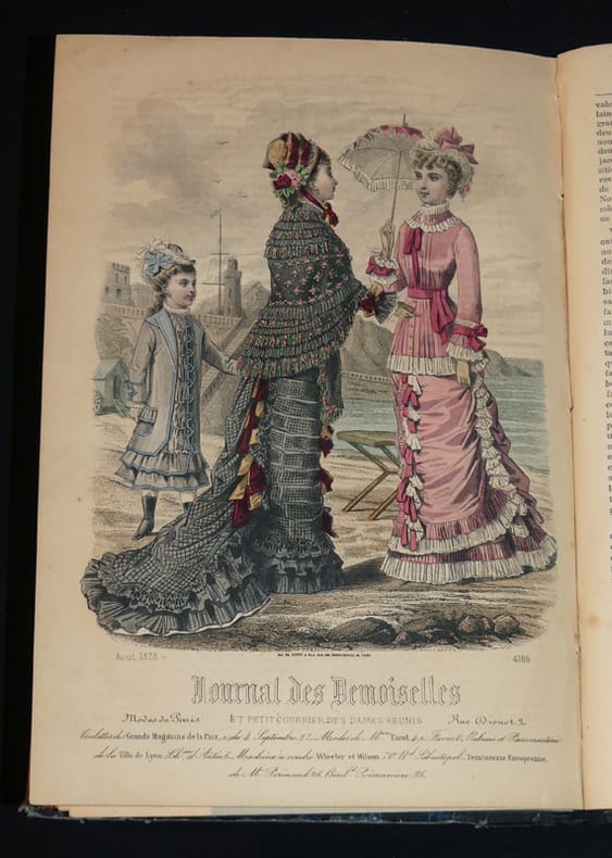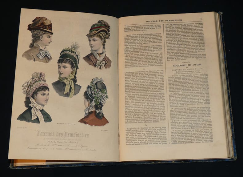 Au bureau du Journal Journal des Demoiselles Relié 1878 ANNEE COMPLETE. In-4 (19x28.5 cm), relié demi-veau, pièce de titre et d'année au dos lisse, 16 gravures de mode en couleurs ; coiffes, coins et coupes frottés, traces de frottement sur les plats, pièce de titre déchirée, intérieur assez frais hormis le nom de l'ancien propriétaire au 2e plat, bon état. Livraison a domicile (La Poste) ou en Mondial Relay sur simple demande.