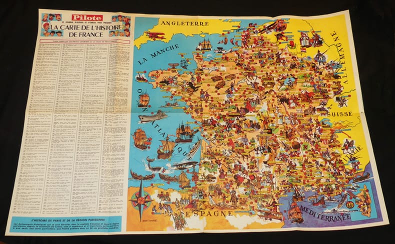 Pilote Affiche In-4, (29.5x21.5 cm, plié en 8), carte en recto illustrée en couleurs avec chronologie, dessin d'Achille Talon au verso, sans date (1965) ; bon état. Livraison a domicile (La Poste) ou en Mondial Relay sur simple demande.