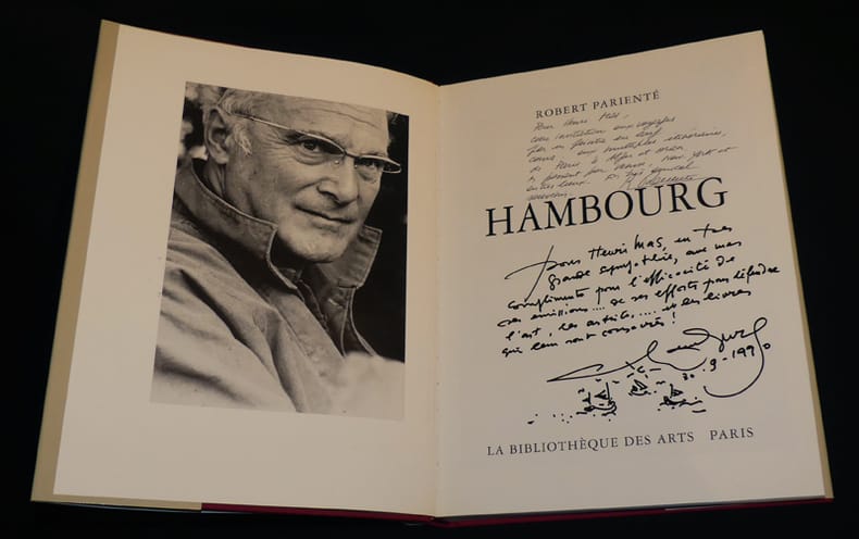 Edition originale enrichie au faux-titre d'un bel envoi autographe à pleine-paged'Hambourg ainsi que d'un croquis du même. Intéressante étude bibliographique agrémentée de nombreuses illustrations. ''Peintre, Hambourg le fut très jeune avec la découverte de ses proches et de Paris, sa ville. Les séjours dans le Midi et l'Afrique du Nord lui ont apporté le goût de la lumière. Lumière encore sur la côte normande qui lui donna un dessin plus personnel, plus vif, à moins que cela ne soit la pratique du croquis pendant la Guerre. Dès la fin des années 40, il éprouve le désir de représenter les autres dans une agitation un peu désordonnée dont seul le peintre sait restituer l'unité : ce sont les plages de Normandie puis les marchés de Provence ou les places de New York plus tard. André Hambourg s'est intéressé très tôt à l'art du livre et à la gravure : dès 1932, il illustrait son premier livre avec cette technique. Il pratiqua régulièrement la lithographie soit pour illustrer des livres soit pour des planches indépendantes, aspect de son art quelque peu occulté par son succès de peintre''. Très belle condition.