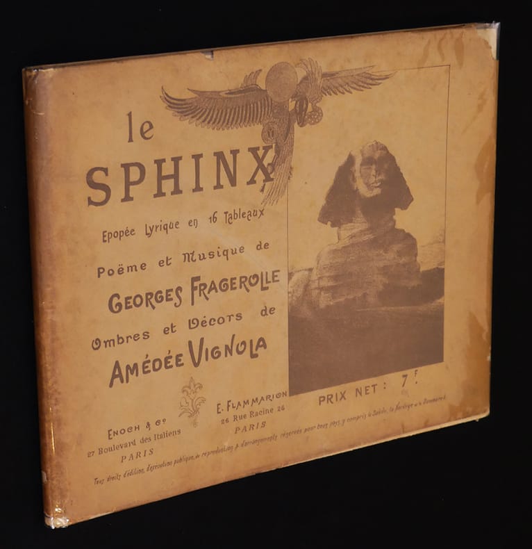 Enoch et Cie, E. Flammarion Cartonnage d'éditeur avec jaquette In-4 (32,4 x 24,5 cm), format à l'italienne, cartonnage illustré en couleurs de l'éditeur, rare exemplaire avec sa jaquette illustrée, ouvrage monté sur onglets, sans date, 40 pages, partition musicale du compositeur Georges Fragerolle (1855-1920, membre du club littéraire les Hydropathes et pianiste attitré du Chat noir), illustrée de 17 compositions en couleurs à pleine page lithographiées par l'éditeur de revues artistiques et décorateur de théâtre Amédée Vignola (Presses de Charles Verneau, imprimeur lithographe, 114 rue Oberkampf) ; quelques incidents sur la jaquette, coiffes et coins légèrement frottés, par ailleurs intérieur frais, bel exemplaire. Livraison a domicile (La Poste) ou en Mondial Relay sur simple demande.