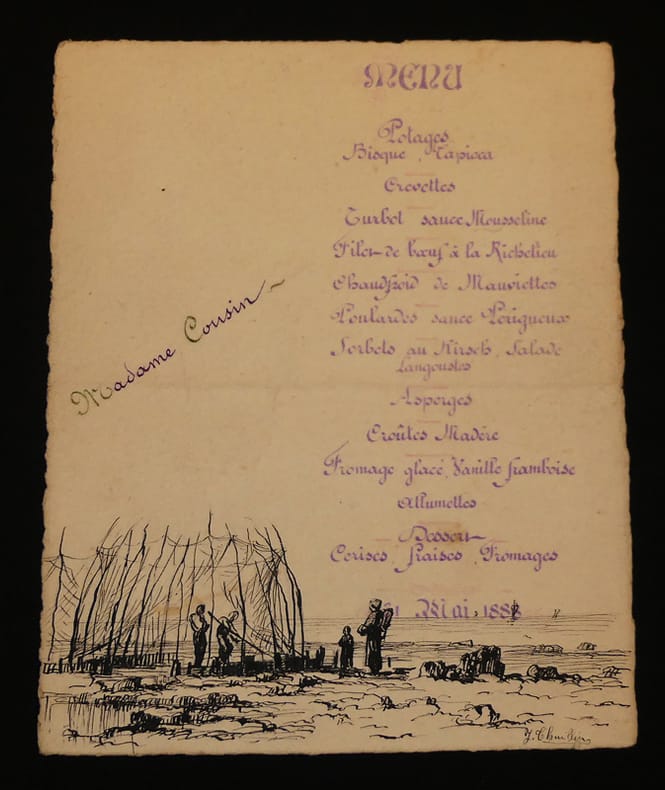 Menu 1888 Menu (13,3 x 16,9 cm) avec dessin signé J. Thuillier ; quelques légères traces, bon état général. Livraison a domicile (La Poste) ou en Mondial Relay sur simple demande.