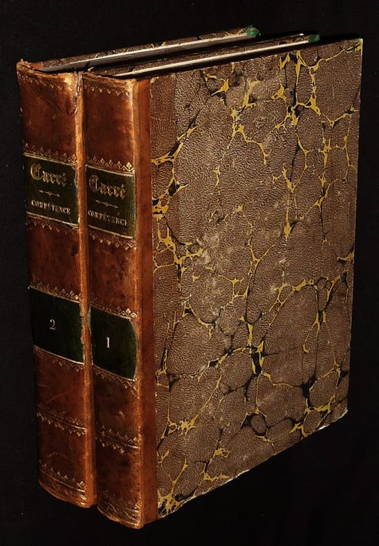 Paris, Chez Pichon-Béchet, sans date (c.1825), 2 volumes in-4 de 260x200 mm environ, Tome I : 1 feuillet blanc, (3) ff. (faux-titre, titre, dédié à ), 6-lxxix-616-21-74 pages, Tome II : 1 feuillet blanc, 829-24-2 pages,1 feuillet blanc, demi-basane fauve d'époque, titres et tomaisons dorés sur dos lisses, ornés de petites frises et fers dorés, gardes et tranches marbrées. Cuir taché, coiffes frottées avec début de fente sur les mors du tome I, quelques rousseurs en début et fin de volume
