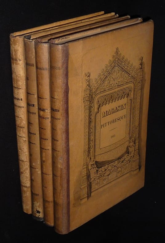 Magasin pittoresque Revue relié "Quatre volumes in-4 (20,3 x 30,5 cm), revue en cartonnages d'éditeur, années 1884 à 1887 du ""Magasin Pittoresque"", 412 pages par volume, illustrations en noir ; traces et frottements sur les plats et dos, par ailleurs assez bon état général. Livraison a domicile (La Poste) ou en Mondial Relay sur simple demande."