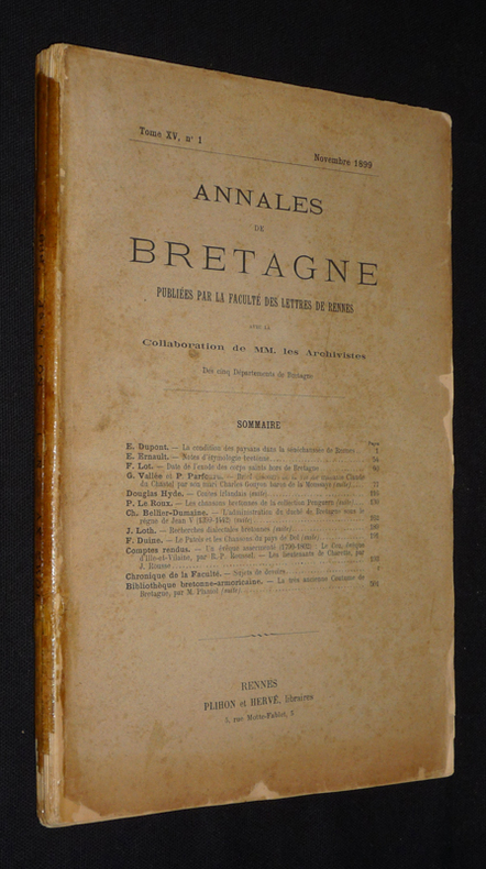 Plihon et Hervé Broché 1899 "In-8 (16,8 x 25 cm), broché, 196 pages + Chronique de la faculté + Bibliothèque bretonne-armoricaine, Tome XV - n°1, novembre 1899 des ""Annales de Bretagne"" ; bords des plats abîmés, réparation à la colle au dos, par ailleurs intérieur frais, assez bon état général. Livraison a domicile (La Poste) ou en Mondial Relay sur simple demande."