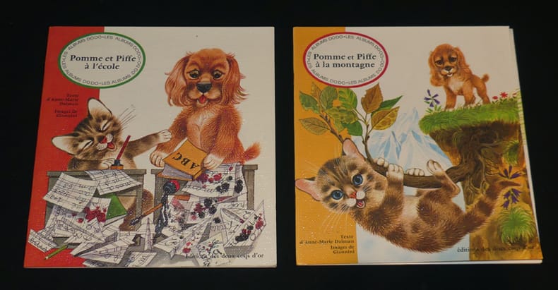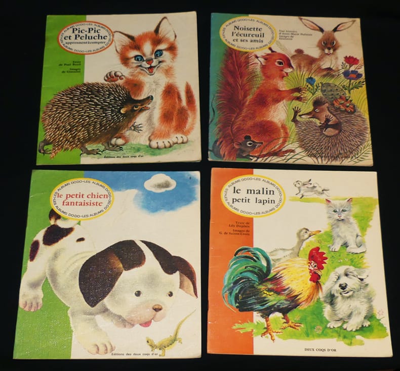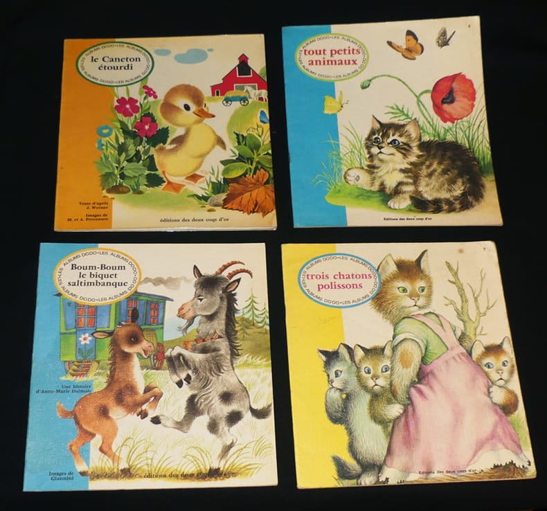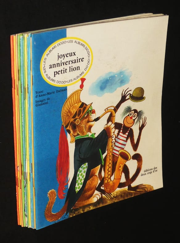Editions des deux coqs d'or Les Albums dodo Album souple Onze albums in-4 broché (25 x 24 cm.), couvertures illustrées, 12 pages illustrées en couleurs par album, ce lot contient les titres suivants : Joyeux anniversaire petit lion - le caneton étourdi - Tout petits animaux - Boum-Boum le biquet saltimbanque - trois chatons polissons - Le petit chien fantaisiste - Noisette l'écureuil et ses amis - Pic-Pic et Peluche - Le malin petit lapin - Pomme et Piffe à la montagne - Pomme et Piffe à l'école, imprimés sur papier gaufré ; quelques défauts de pelliculage, ensemble en bel état. Livraison a domicile (La Poste) ou en Mondial Relay sur simple demande.