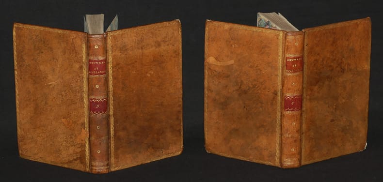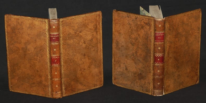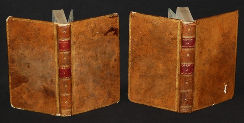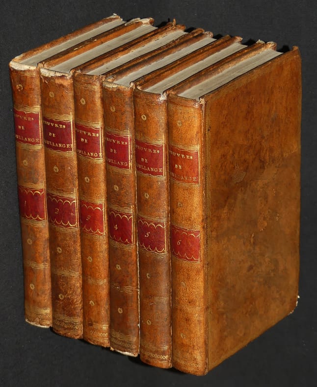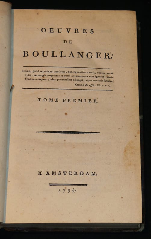 A Amsterdam Relié 1794 6 volumes in-8 (13,5 x 21 cm), reliés plein veau blond marbré, dos lisse orné, pièces de titre et tomaison, roulettes aux plats, papier à la cuve aux gardes, ex-libris Mailly, 396 & 408 & 342 & 366 & 374 & 420 pages, se répartissant comme suit : tome I & II : 'L'Antiquité dévoilée par ses usages', tome III : 'Recherche sur l'origine du despotisme', 'Observations sur l'esprit des loix', 'Essai philosophique sur le gouvernement', 'Esope fabuliste', 'Du bonheur', tome IV : 'Le Christianisme dévoilé', 'Dissertation sur Elie et Enock', 'Examen critique de Saint-Paul', 'Dissertation sur Saint-Pierre', tome V : 'De la cruauté religieuse' et les articles qu'il a écrit pour L'Encyclopédie ('Corvées', 'Déluge', 'Guèbres', 'Langue Hébraïque' et 'Economie politique'), tome VI : 'Histoire d'Alexandre le Grand', complet en 6 volumes, ces écrits sont en réalité l'oeuvre du Baron d'Holach, qui pouvait difficilement assumer son livre antichrétien 'Le Christianisme dévoilé' et ont été faussement attribuées à Nicolas-Antoine Boulanger ; cinq coiffes manquantes, coins usés, petit manque 1er plat tome 2, tache tome 1, quelques rousseurs principalement en début et fin d'ouvrage, légères épidermures, mors antérieur tome 4 fendu, assez bon état d'ensemble. Livraison a domicile (La Poste) ou en Mondial Relay sur simple demande.