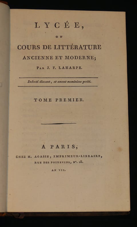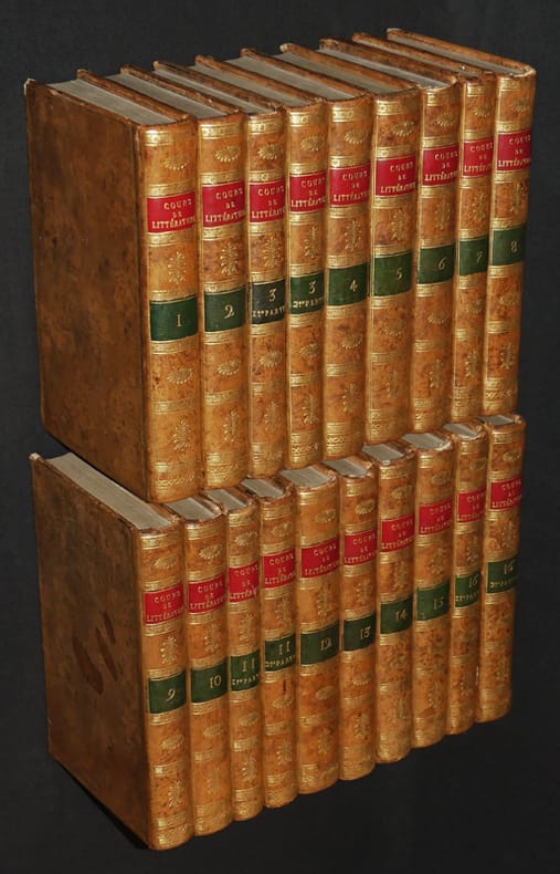 Paris chez H. Agasse, imprimeur-libraire 1799 Ensemble de 16 tomes en 19 volumes in-8° (13 x 20,2cm). Reliure de l'époque en basane flammée, dos lisse orné de pièces de titre et de tomaison, de filets, de guirlande et de petits fers dorés, filet, dent-de-rat et dentelle sur les plats, roulette dorée sur les coupes et sur les chasses, gardes cailloutées, toutes tranches dorées. (quelques volumes légèrement frottés, certains dos légèrement tâchés, petit manque à cinq coiffes, petit travail de ver sur quelques reliures mais sans gravité, présence de quelques rousseurs pâles et brunissures sinon intérieur frais). Un grand classique, maintes fois réédité, ici dans l'édition originale publiée entre 1799 et 1805. Les tomes 3, 11 et 16 se présentent chacun en deux parties; le tome 15 et la première partie du tome 16 renferment " De la philosophie du XVIII° siècle", la seconde moitié du tome 16 contient la table analytique et se termine par une vie de Laharpe. Bel ex-libris ancien sur les contre-plats : JULES HENISSART LE DROIGT CHEMIN. Agréable ensemble à la reliure décorative.