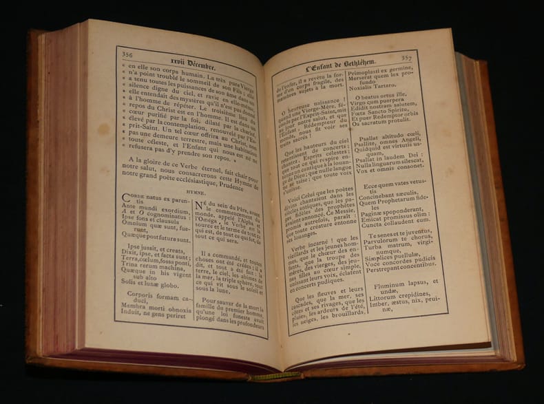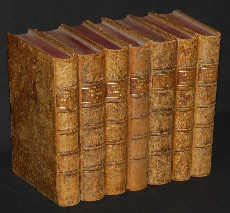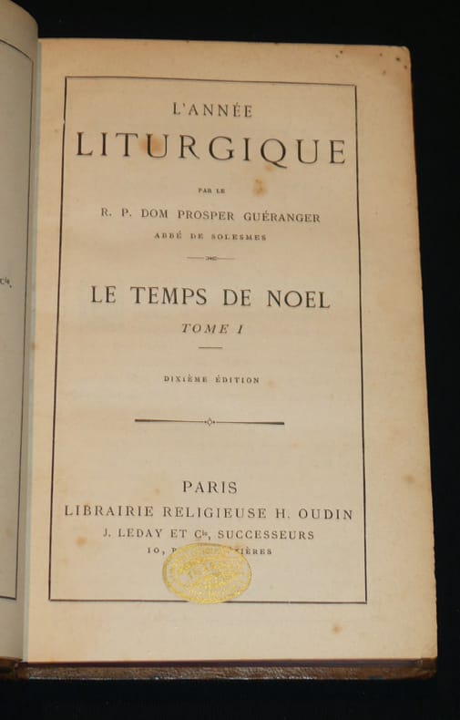 Librairie religieuse H. Oudin Relié 1890 "Sept volumes in-12 (12x 18 cm), reliés plein veau blond tacheté, pièce de titre et cinq nerfs au dos, papier à la cuve marbré aux gardes, tranches rouges, roulettes dorées aux coupes, texte encadré, notre série incomplète ""L'Année liturgique"" du R. P. Dom Guéranger Prosper, abbé de Solesmes comprend : Le temps de Noël (vol. 1 et 2), Le temps de la Septuagésime (1 vol.), Le temps Pascal (vol. 3), Le temps après la Pentecôte (vol. 2 / 4 / 5) ; épidermures au dos, nerfs, coiffes et coins frottés, intérieur frais, bon état d'ensemble. Livraison a domicile (La Poste) ou en Mondial Relay sur simple demande."