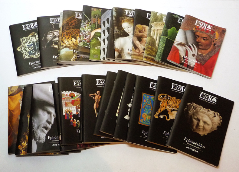 Franco Maria Ricci (FMR) Dos agrafé "In-12 (11 x 16,3 cm), dos agrafé, lot de 28 ""Ephémérides internationales"" des éditions Franco Maria Ricci, de avril-mai 2002 à décembre-janvier 2007 (SAUF le numéro de juin-juillet 2002) ; très bon état général. Livraison a domicile (La Poste) ou en Mondial Relay sur simple demande."