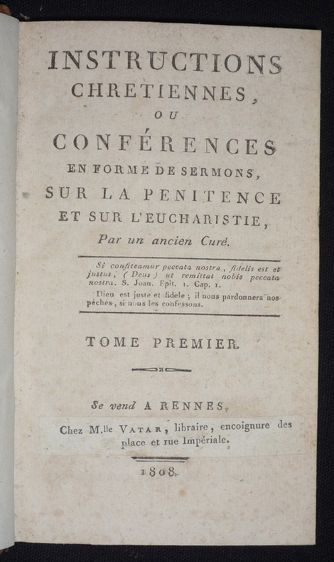 A Rennes, chez M.lle Vatar, libraire, encoignure des place et rue Impériale Relié 1808 In-12 (10,3 x 16,8 cm), reliure demi-peau, dos lisse, ij-331 pages ; coupes et coiffes abîmées, papier reliure déchiré et éraflé aux plats, manque de cuir au dos en tête, par ailleurs intérieur frais, en l'état. Livraison a domicile (La Poste) ou en Mondial Relay sur simple demande.