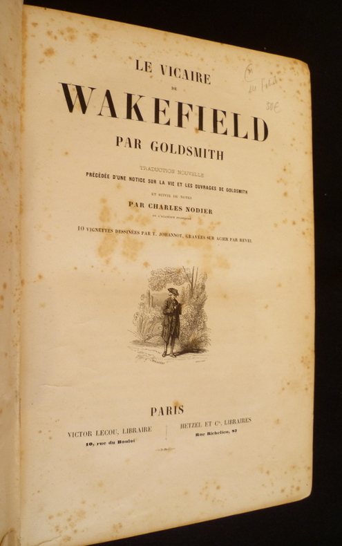 Paris, Bourgueleret, 1838 ; in-8, XXXVII pp. + 581 pp., reliure demi-veau brun, dos lisse orné, toutes tranches dorées. Reliure signée C. Blaise, rue du Bac. Petites rousseurs et une légère mouillure. Olivier Goldsmith, né à Pallismore en 1728, mort en 1774, était un écrivain irlandais. Il commença sa vie par un voyage en Europe, puis se fixa à Londres, où il rédige son célèbre roman Le Vicaire de Wakefield, utilisant l'introspection. Il est enterré à Westminster. Traduction et notes de Charles Nodier. Bon état.