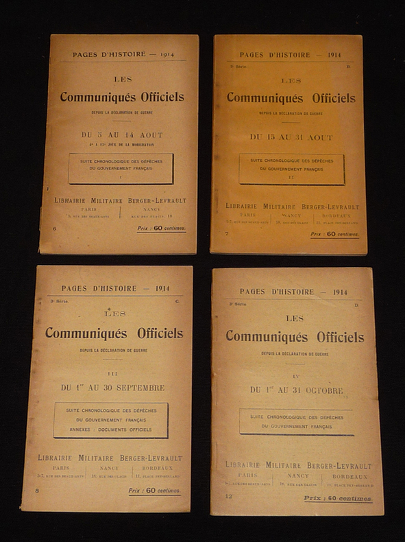 Librairie militaire Berger-Levrault Pages d'histoire Agrafé 1914 "Quatre volumes in-12 (11 x 17 cm), agrafés sous couverture, n°1 à 4 des ""Communiqués officiels depuis la déclaration de guerre. Suite chronologique des dépêches du gouvernement français"" couvrant la période du 5 août au 31 octobre 1914 ; quelques marques d'usage sur les plats, dont quelques petites déchirures au n°4, par ailleurs bon état. Livraison a domicile (La Poste) ou en Mondial Relay sur simple demande."
