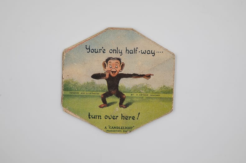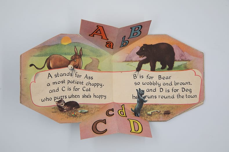 "A ""Candlelight"" production. England" Album Pop-up 1945 "JOLI POP-UP REVERSIBLE. TRES RARE. ABC Pop-up Trough Animal-Land. Designed and illustrated by E. Arthur Boughey. A ""Candlelight"" production. England [vers 1945]. Octogone (12x12,5 cm), 4 doubles scènes dépliantes sur un côté, (3) sur l'autre, papier toilé, singe portant le titre sur la première couverture, singe humanisé sur la seconde indiquant à l'enfant qu'il doit tourner le livre ""You're only half-way..."". Pop-up réversible sur papier toilé et de petite dimension pouvant faire penser à un ouvrage publié durant la Seconde Guerre mondiale et ses restrictions. Réalisé par l'artiste britannique Arthur Boughey. Pliage simple d'une longue feuille de papier où seules les initiales se déplient en tête et en pied des images à l'ouverture. Abécédaire des animaux avec deux animaux par page encadrant un quatrain définissant les images. ; Bon exemplaire. Livraison a domicile (La Poste) ou en Mondial Relay sur simple demande."