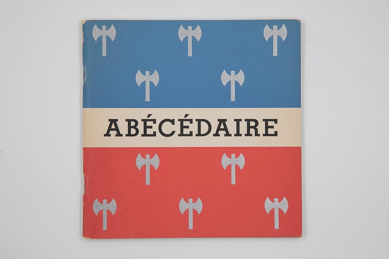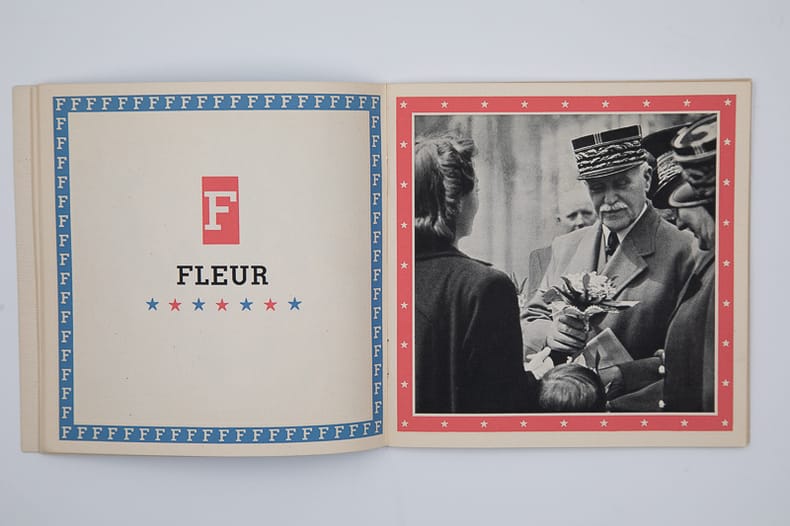 Draeger, imp. Montrouge broché 1943 ABECEDAIRE A LA GLOIRE DU MARECHAL PETAIN. Abécédaire. Edité par le Bureau de documentation du chef de l’état. 1943. Draeger, imp. Montrouge. In-12 carré (14 x 14 cm). (56) pp., couvertures de papier fort bleu, blanc, rose, francisques argentées sur la première, francisque argentée dans un carré bleu et rose sur la seconde. Unique édition. Abécédaire illustré par la photographie à la gloire du Maréchal Pétain. Une première page d’alphabet blanc sur fond bleu et une lettre de l’alphabet par double page. La lettre sur fond rouge est placée dans un encadrement de cette même lettre répétée sur fond bleu. Une qualité du maréchal débute par cette initiale et, en regard, un cliché du maréchal la qualifie. A comme Amour et le maréchal proche du drapeau de la République française, B comme Blé et le maréchal près d’une gerbe de blé, C comme Caresse et le maréchal caressant un mouton, etc. Une planche d’alphabet blanc sur fond rose termine l’ouvrage; Parfaite condition. Livraison a domicile (La Poste) ou en Mondial Relay sur simple demande.