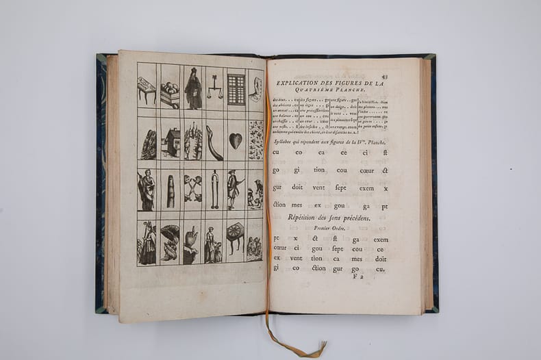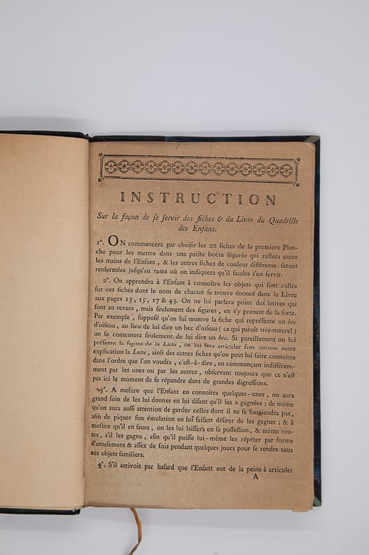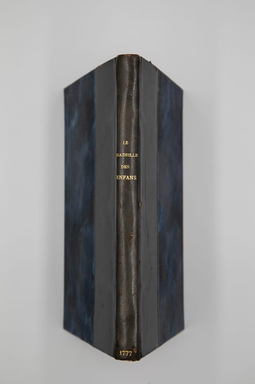 Chez Couturier père, aux Galleries du Louvre Relié 1777 "TRÈS RARE ÉDITION DE 1777. RECHERCHÉE. CONTENANT LES 7 PAGES D'INSTRUCTION SUR LA FAÇON DE SERVIR DES FICHES...Le Quadrille des enfants. Ou système nouveau de lecture. Avec lequel tout enfant de quatre à cinq ans peut, par le moyen de quatre-vingt-huit figures, être mis en état de lire sans faute à l'ouverture de toutes sortes de livres en trois ou quatre mois, & même beaucoup plutôt, selon les dispositions de l'enfant. Quatrième édition, revue, abrégée & perfectionnée à l'usage des jeunes élèves de la pension académique du Faubourg S. Honoré, n°42. Chez Couturier père, aux Galleries du Louvre. Paris. 1777. avec Approbation & Privilège du Roi. In-8 (21,5x14 cm), 7 pages d'""Instruction sur la façon de se servir des fiches et du livre du Quadrille des Enfants"", 142, (2 : Approbation et Privilège) pp., (4) planches gravées, demi basane bleu nuit, dos lisse, titre et date dorés (reliure moderne). Rare quatrième édition du Quadrille des enfants publié en 1744 par Claude-Louis Berthaud. Les quatre planches gravées correspondent aux 88 figures de la méthode. Ces figures étaient également appliquées sur des planches en os avec le phonème correspondant au verso. La méthode reposant sur l'association de sons et d'images familières aux enfants. L'auteur dans son discours préliminaire incite à ""ne pas craindre à faire la dépense des fiches"", le précis des instructions imprimé à part ne devrait être livré qu'à ceux qui les achetaient. Il est ici relié en tête. Le Discours préliminaire se termine par la liste des enfants qui ont appris à lire par la méthode (avec le nom de leurs parents et leur adresse). Le Journal Encyclopédique ou Universel de l'année 1778 mentionne ""l'extrême utilité de cet ouvrage, dont on est redevable à feu M. Berthaud, est suffisamment connue"". L'édition de 1777 est très rare. Livraison a domicile (La Poste) ou en Mondial Relay sur simple demande."