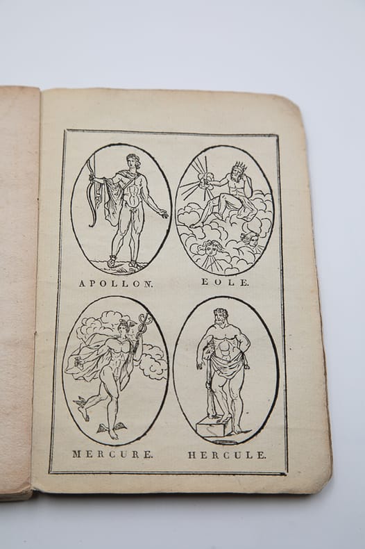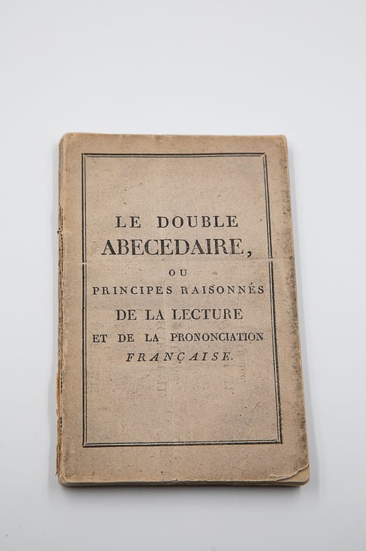 Chez Blocquel et Castiaux, imprimeurs-libraires, Grande place. Lille Broché 1810 TRES RARE. UN UNIQUE EXEMPLAIRE REFERENCE A LA CLEVELAND PUBLIC LIBRARY. Le Double Abécédaire. Ou Principes raisonnés de la Lecture et de la Prononciation Française ; Suivi d’un Abrégé de la Mythologie, d’un Recueil de Pensées, Maximes, Anecdotes, Fables, etc. Chez Blocquel et Castiaux, imprimeurs-libraires, Grande place. Lille. 1810. In-12 (16 x 10,5 cm). Frontispice (séparé en 4 gravures : Création du Monde, Adam et Eve, Le Déluge, Le Sacrifice d’Abraham), 89 pp., 4 planches gravées : brochure de l’époque, couvertures de papier portant le titre identique imprimé dans un double encadrement sur la première et la seconde. Méthode élaborée d’apprentissage de la lecture, principalement axée sur la prononciation des syllabes et des mots de la langue française, agrémentée de très nombreuses listes d’exemples. Une première page de divers alphabets, dont des alphabets mêlés et renversés. Suivent : sons formés d’une consonne et d’une voyelle, mots de deux et trois syllabes formés des mêmes sons, monosyllabes qu’il faut lire d’abord par sons séparés & ensuite tout d’un mot, Règle de prononciation pour les verbes, Des voyelles longues & des voyelles brèves et des exemples de mots qui s’écrivent et se prononcent différemment. Puis Un extrait du Traité de M. l’Abbé d’Olivet explique les suffixes qui auront toujours un son bref ou long. La troisième partie est consacrée à la religion (Idée de Dieu, L’Oraison dominicale, La Salutation évangélique, Le Symbole des Apôtres, Les Commandements et les Pensées Chrétiennes). Les premières lectures sont constituées ensuite d’un texte de Fénelon, La Belle Education, et de dix fables. La dernière partie, De la Mythologie, écrite sous forme de demandes et réponses est ornée de quatre belles planches, gravées sur un fort papier, comportant chacune quatre gravures de divinités mythologiques dans un ovale. Ouvrage recherché dont un seul exemplaire est référencé à la Cleveland Public Library. Exemplaire bien conservé malgré de petits manques sur le dos. Livraison a domicile (La Poste) ou en Mondial Relay sur simple demande.