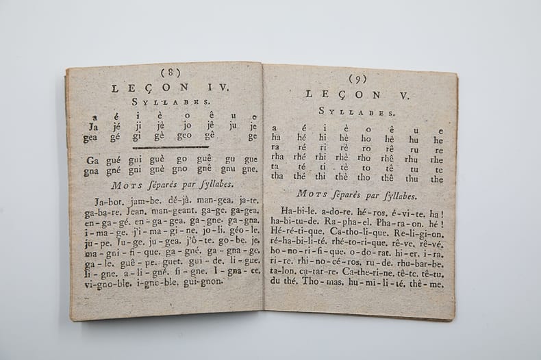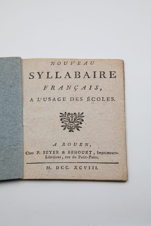 Chez P. Seyer & Behourt, Imprimeurs-Libraires, rue du Petit-Puits. A Rouen Broché 1798 RARE OUVRAGE REVOLUTIONNAIRE DE COLPORTAGE. Nouveau syllabaire français, à l’usage des écoles. Chez P. Seyer & Behourt, Imprimeurs-Libraires, rue du Petit-Puits. A Rouen. 1798. In-16 (12,1 x 10,2 cm). 30 pp., (1) f. blanc, broché, couvertures muette de papier bleu de l’époque. Rare ouvrage révolutionnaire de colportage. Il comporte une première page d’alphabets en lettres romaines et italiques et les voyelles, consonnes et cédille au revers. Suivent seize leçons progressives de syllabes et de mots séparés en syllabes. À la suite, Déclaration des droits et des devoirs de l’homme et du citoyen, également séparée en syllabes. Pierre Seyer, imprimeur de la Société des amis de la Constitution et de la Société des amis de la Liberté et de l’Egalité était ouvertement prorévolutionnaire. Il avait épousé la veuve de J. F. Behourt en 1763 et repris son fonds, en grande partie constitué de la Bibliothèque bleue de Rouen. Il travailla en association avec son beau-fils, Pierre-Louis Behourt, de 1787 à 1805 environ. En parfaite condition, dans sa brochure d'origine. Livraison a domicile (La Poste) ou en Mondial Relay sur simple demande.