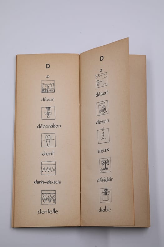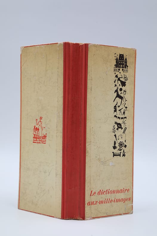 Les petites Etudes. Le Roleur. Saint-Saulve (Nord) Album cartonné 1935 "AVEC UN RARE ENVOI DE L'AUTEUR. PREMIÈRE ÉDITION DE 1935. Dictionnaire aux-mille-images. Les petites Etudes. Le Roleur. Saint-Saulve (Nord). 1935. Imprimeries ""La Province"", 13 rue de la Petite Guirlande à Mons (Belgique). (22x8,2 cm), (1) f., (220) pp., (1) f., album de l'éditeur très étroit, demi percaline rouge, plats de papier crème avec un filet en encadrement rouge, le premier illustré sur le bord externe d'une composition verticale de petits sujets stylisés noirs, signe illustré de l'éditeur en rouge sur le second. Ouvrage de la pédagogue et écrivain Amélie Dubouquet (1904-1997). Elle participa au mouvement de l'Education nouvelle, ses titres sont encore édités au Père Castor. Publié chez l'auteur, cet abécédaire liste verticalement de nombreuses occurrences pour chaque lettre. Elles sont illustrées de petits sujets en noir, placés dans un carré, avec leur nom authographié entre chaque image. Hommage de l'auteur au crayon sur la première garde volante. Livraison a domicile (La Poste) ou en Mondial Relay sur simple demande."