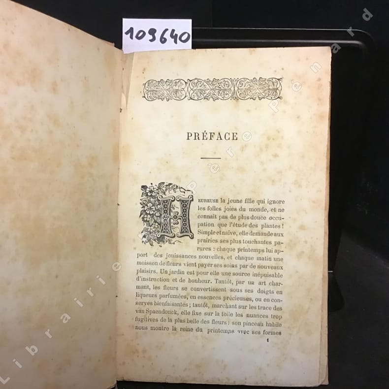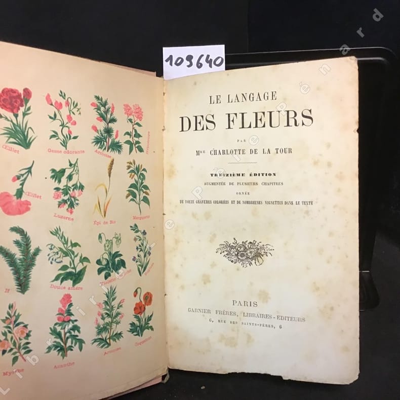 L’ancien et le nouveau langage des fleurs. Dévoilé et expliqué au moyen de l’interprétation symbolique des plantes, fleurs, fruits etc.etc. Suivi de la nomenclature exacte dont chaque fleur est l’expression. Terminé par l’allégorie et emblèmes des couleurs, l’horloger baromètre de flore. Ouvrage le plu complet contenant la signification de plus 1000 fleurs. Enrichi de 30 gravures. Paris Le Bailly libraire sans date.(1858 ?)In 12 broché, faux-titre, frontispice, titre, 108 pages, figures en noir dans le texte. Petites restauration à la couverture.