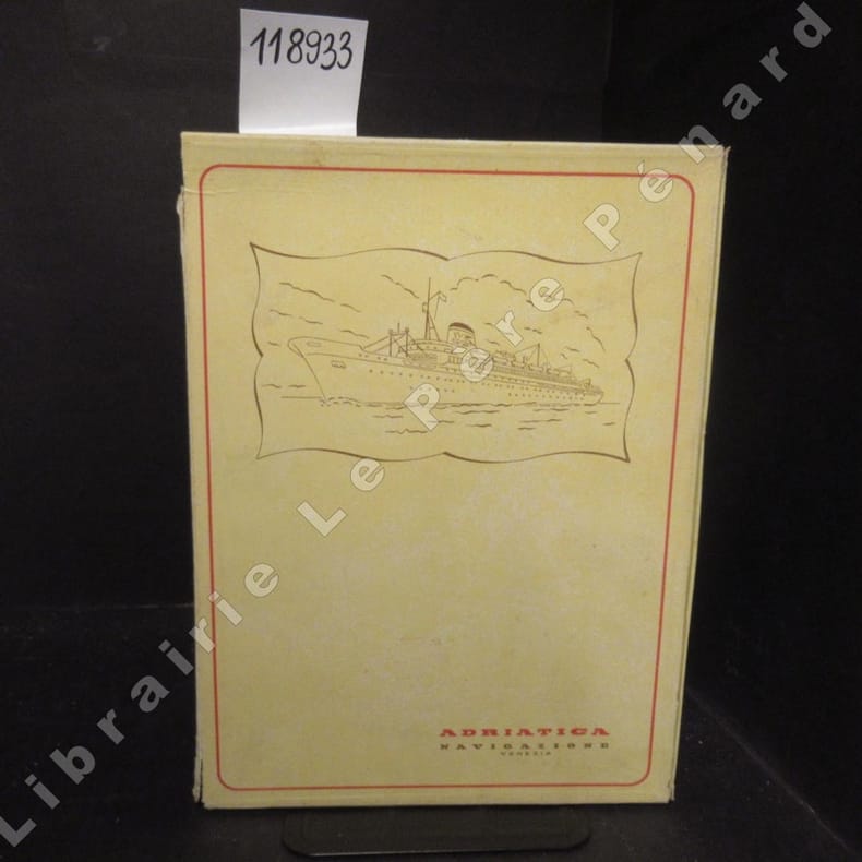 1965 Adriatica Navigazione - Sans date ( une mention manuscrite interne indique1965) - 1 pochette cartonnée de format in-4 décorée d'une silhouette d'un paquebot et légendée Adriatica Navigazione Venezia - Huit pièces illustrées en couleur - Mention manuscrite sur l'intérieur de la chemise "Retour du Liban 1965. Excellent caviar"