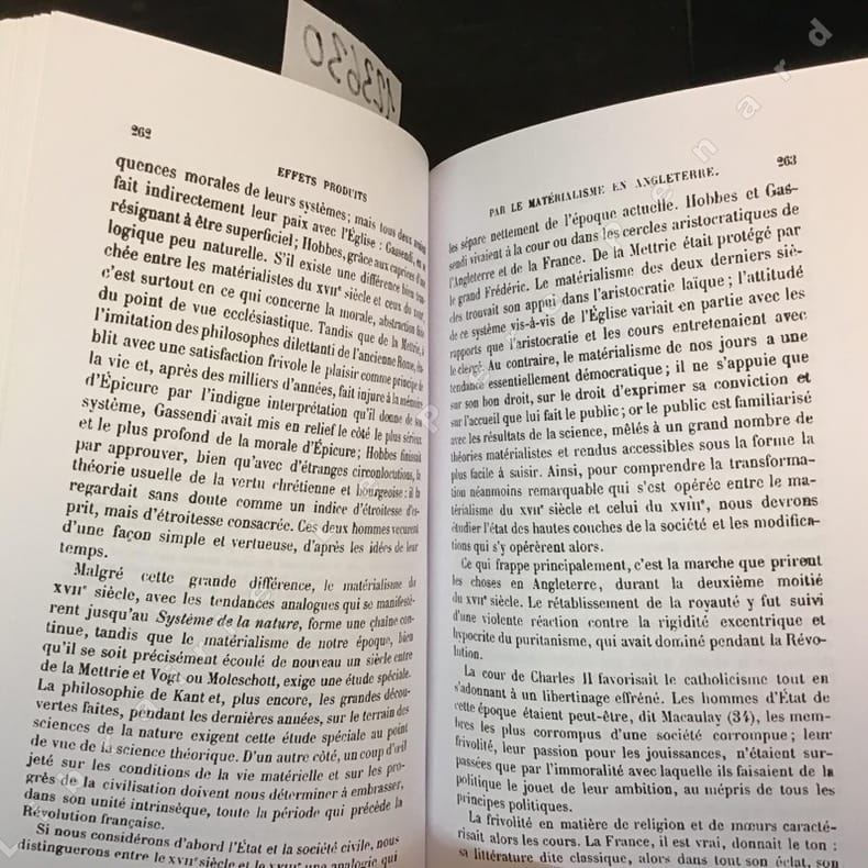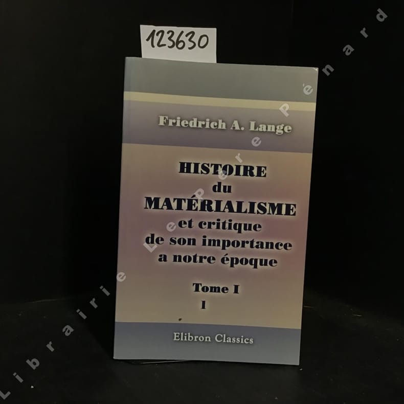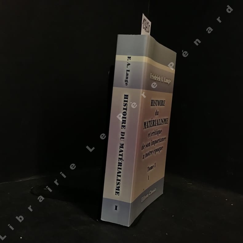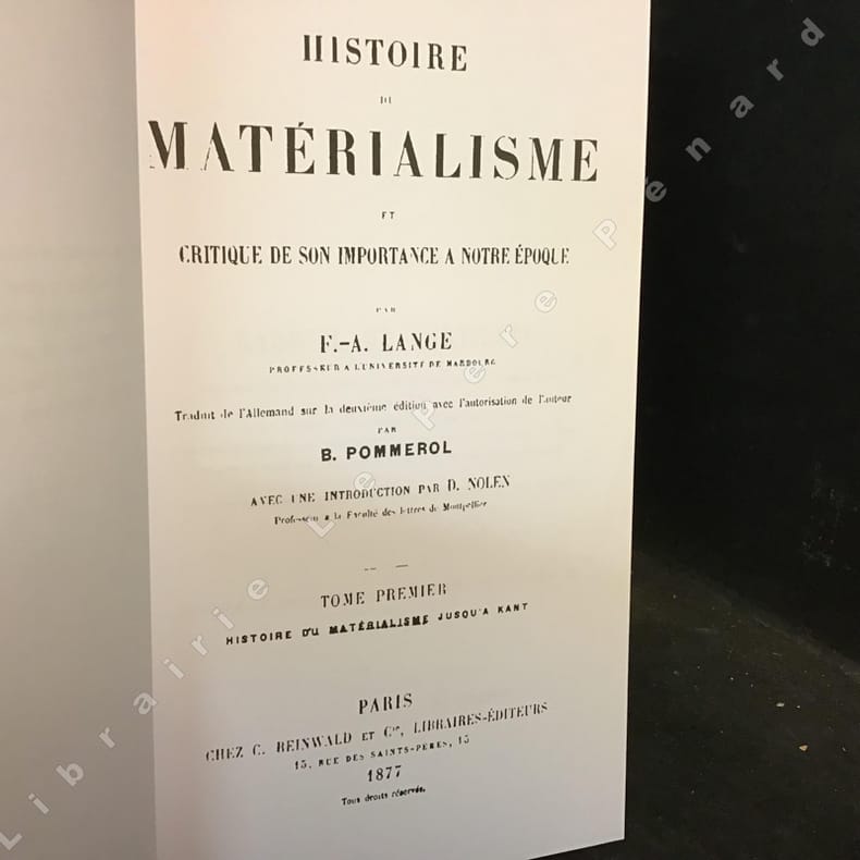 ---- PREMIERE EDITION FRANCAISE ---- BON EXEMPLAIRE ---- "LANGE, philosophe, sociologue et historien allemand (1828-1875) est surtout connu par la critique qu'il fit du matérialisme dans son ouvrage FONDAMENTAL "HISTOIRE DU MATERIALISME ET CRITIQUE DE SON IMPORTANCE A NOTRE EPOQUE". (ZAPATA "Dictionnaire des philosophes", T.2) ---- Le matérialisme dans l'Antiquité - La période de transition - Le matérialisme du XIIe siècle - Le matérialisme du XIIIe siècle - La philosophie moderne - KANT et le matérialisme - Les sciences physiques - Le matérialisme et les recherches exactes - Force et matière - La cosmologie d'après la science de la nature - Darwinisme et téléologie - Place le l'homme dans le monde animal - Le cerveau et l'âme - La psychologie conforme à la science de la nature - La physiologie des organes des sens et l'univers en tant que représentation - L'économie politique et la dogmatique de l'égoïsme - Le christianisme et le rationalisme - Le matérialisme théorique dans ses rapports avec le matérialisme moral et avec la religion - Le point de vue de l'idéal**85810/8581/P4