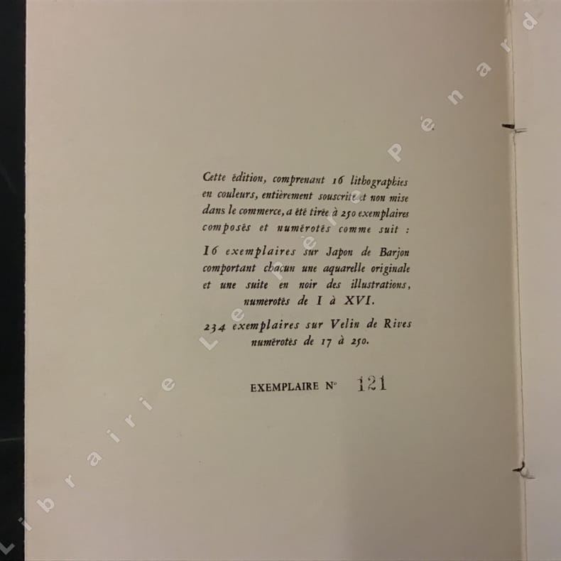 1948 Aux dépens d'un amateur, Bruxelles - 1948 - Un volume in-4, broché, couverture rempliée - 151 pages - Ouvrage comprenant 5 des 16 lithographies en couleurs, l'un des 234 exemplaires sur Vélin de Rives, numéroté 121