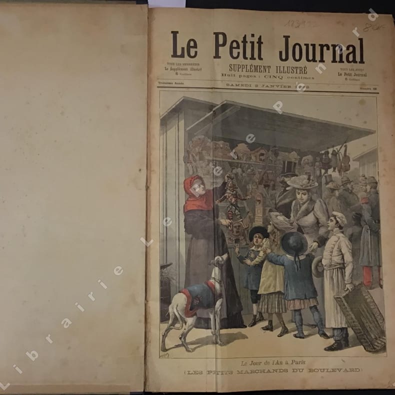 1892 Le Petit Journal - Année 1892 (Année complète du N°52 du 2 janvier 1892 au N° 110 du 31 décembre 1892) - In folio, relié, couverture cartonnée illustrée en couleurs, dos toilé - 424 pages - Nombreuses gravures en couleurs in textes (Une et quatrième de chaque numéro)