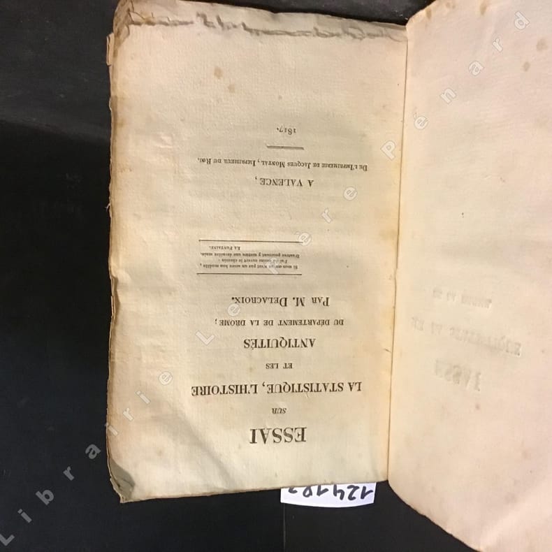 Histoire, topographie des anciens peuples et du passage d'hannibal dans le département, population, agriculture, commerce, industrie, (templiers - vaudois et albigeois - muriers - vers à soie - truffes -distillateurs - minéralogie, etc.), important dictionnaire des communes (256 pages): description et état politique.Nicolas Delacroix, homme politique, Employé à la sous-préfecture de Nyons, il est chef de division en 1810, puis passe à la préfecture de la Drôme. Député de la Drôme pendant les Cent-Jours. Conseiller municipal de Valence en 1821, il est maire en 1830 et conseiller général. Il est député de la Drôme de 1839 à 1843, siégeant dans la majorité soutenant les gouvernements de la Monarchie de Juillet. Décédé le 7 juillet 1843 à Valence (Drôme).
