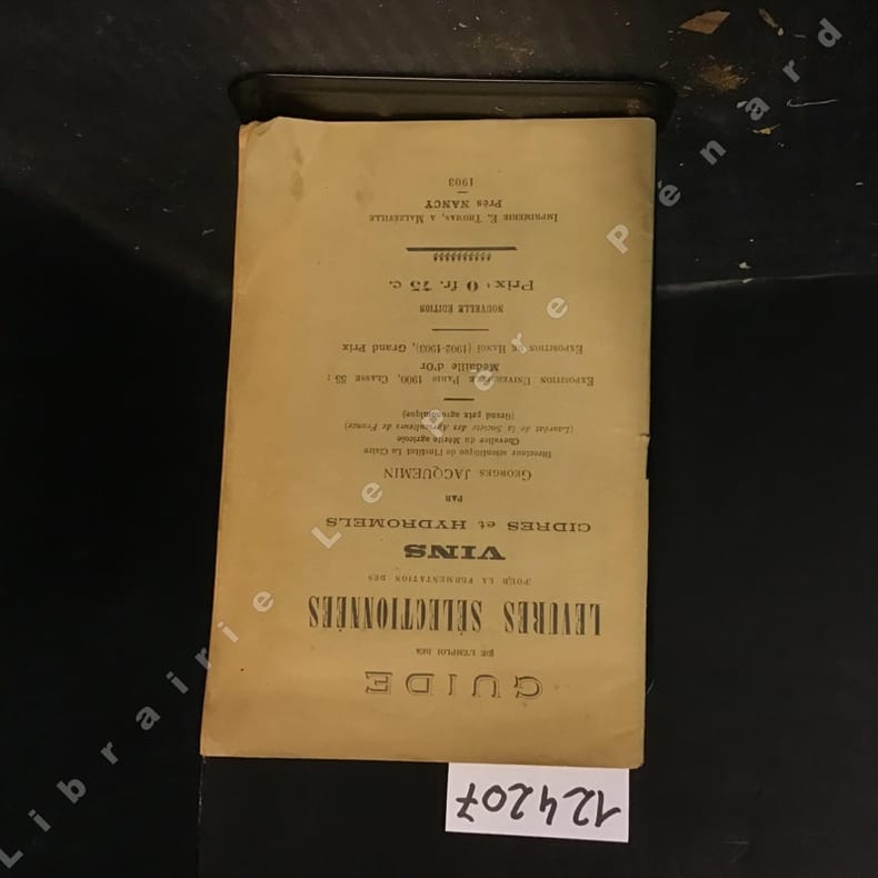 Guide publié par Jacquemin à l'occasion de sa participation à 1) l'Exposition Universelle, Paris 1900, classe 55: - médaille d'or pour son procédé de culture des levures. pures selectionnées / 2) l'Exposition de Hanoï (1902-1903), - grand prix pour son procédé. Georges Jacquemin, célèbre oeno-chimiste, était directeur scientifique de l'Institut La Claire et est auteur d'ouvrages fondamentaux de viticulture et vinification. Ce titre ne figure pas dans la collection de Kilian Fritsch. Cf. Oberlé-Fritsch 242-244. Image disp.