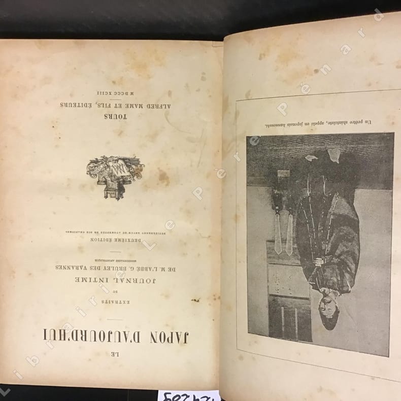 Alfred Mame & Fils-Tours 1893 In-4. Reliure demi-chagrin cerise, dos à nerfs, caissons richements ornés, fer de prix au premier plat, 368 pp. Frontispice en noir “ Un prêtre shintoiste, appelé en japonais kannoushi”. Illustrations en noir in et hors-texte. Très bon exemplaire.