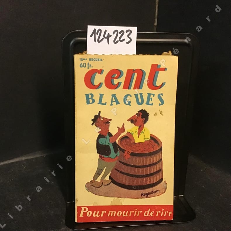 Editions du Puits-Pelu 1953. In-12 broché de 95 pages au format 9 x 16 cm. Couverture illustrée. Dos carré, insolé, avec petits frottis et infimes manques en haut et en bas. Plats et mors brunis, avec petites taches brunes au 4ème plat. Intérieur assez frais avec rousseurs et page d'achevé d'imprimer tachée. Couverture couleurs et illustrations en noir par Roger Sam. 16 ème recueil 100 blagues entièrement réalisé par Frédéric Dard, Léopold Massiéra, Gaston Montbray et Roger Sam. Blagues, et contes inédits par Frédéric Dard ( Dix mille francs signé Charles Antoine, L’argot.. tel qu’on le jaspine signé F. Charles, Le grand’ père signé Jules ). Edition originale en état juste correct.