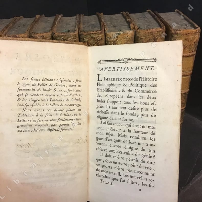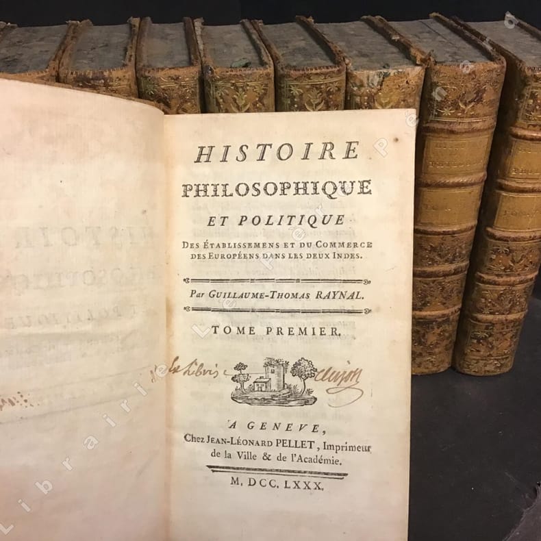 TROISIÈME ÉDITION. C'est l'édition définitive de l'un des ouvrages clefs de la crise de l'Ancien Régime. Elle est illustrée d'un PORTRAIT de l'auteur d'après Cochin, par De Launay, de NEUF FIGURES gravées hors-texte d'après MOREAU LE JEUNE et placées en frontispice ainsi que de 24 TABLEAUX dépliants, qu'on trouve généralement insérés dans l'atlas. MANQUE L'ATLAS au format in-quarto qui contient 50 cartes. L'"Histoire des deux Indes" de l'abbé Raynal, ouvrage auquel DIDEROT pris une large part aux côtés d'Holbach, de Naigeon, et de nombreuses autres figures de la philosophie et des sciences, fut mis à l'index dès sa première publication en 1770. Cet ouvrage est à la fois une histoire des explorations et des installations commerciales européennes dans le monde et une dénonciation parfois violente de l'esclavage et de l'exploitation des colonies par les métropoles. Les emprunts aux mémoires administratifs et aux traités antérieurs alternent avec des morceaux d'éloquence révolutionnaire, souvent dus à la plume de Diderot. S'attaquant également aux institutions religieuses, au despotisme monarchique et à l'intolérance, l'"Histoire des deux Indes" constitue un VÉRITABLE BRÛLOT PHILOSOPHIQUE. Exemplaire en BEL ÉTAT, en reliure d'époque au dos décoratif. (Michel Delon, "En français dans le texte", 166 - Sabin, 68081 - Mahérault, "L'Oeuvre de Moreau le jeune", n°237). NICE COPY. PICTURES AND MORE DETAILS ON REQUEST.
