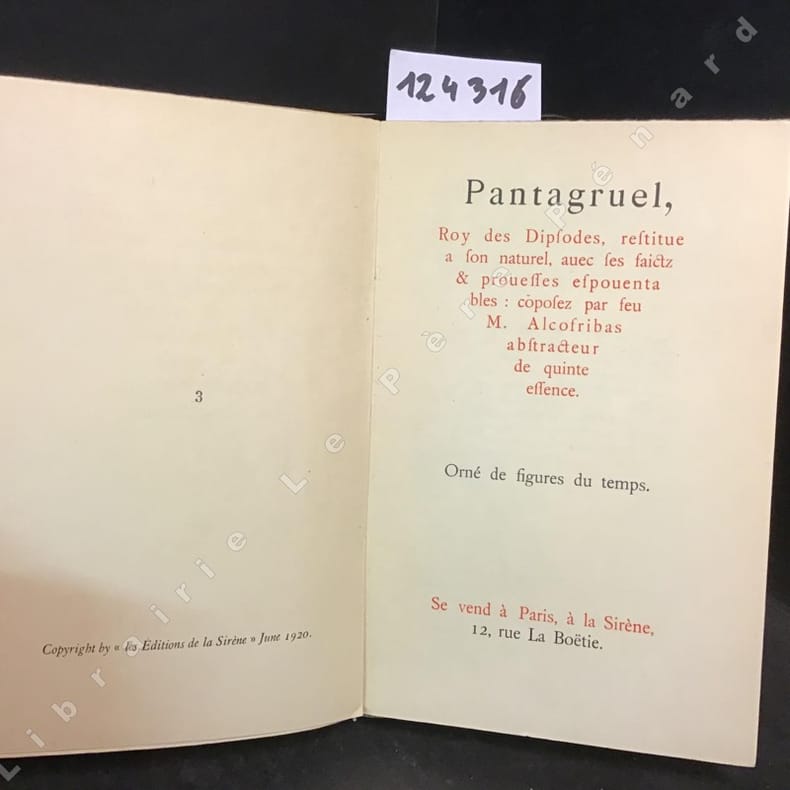 1920 Se vend à Paris, à la Sirène - 1920 - Collection "Les Oeuvres de Françoys Rabelais" - In-8, broché, couverture rempliée - 253 pages - La présente édition est la troisième de la série "Rat de Bibliothèque" - Tirage de tête, l'un des 20 exemplaires sur Japon impérial (premier papier), numéroté 3/20 - Nombreuses illustrations en N&B dans le texte ainsi que des ornements (bandeaux, lettrines, culs-de-lampe)