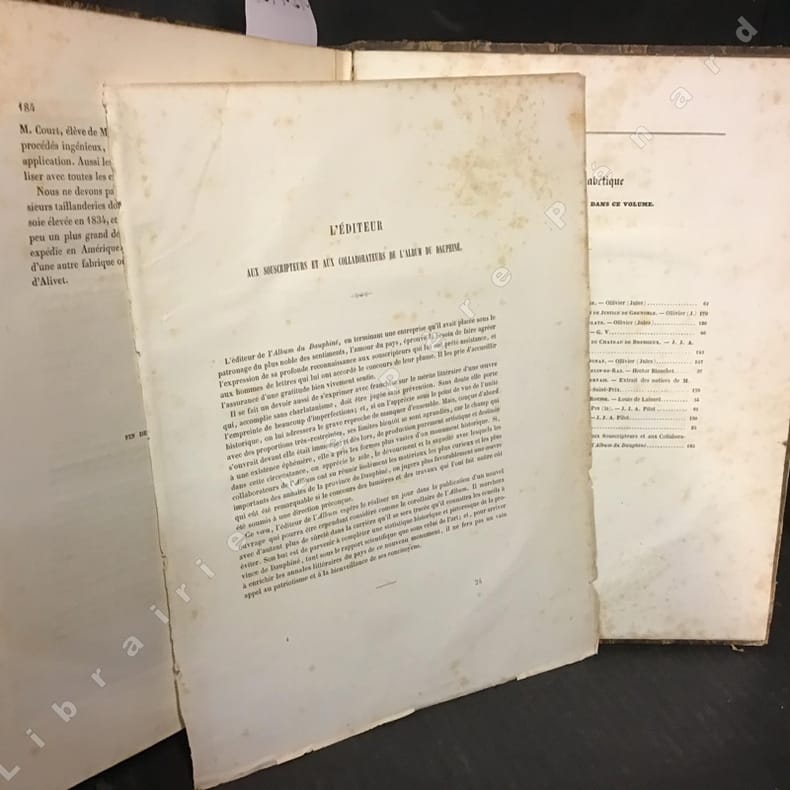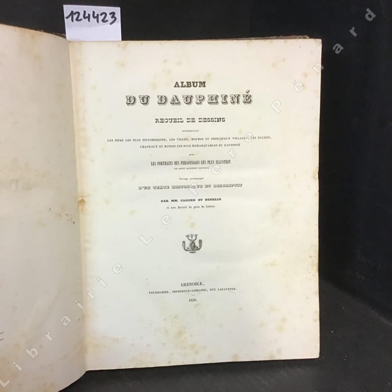 Tout ce qui a paru de cette belle publication réalisée par souscription, et offrant à la fois des articles sur les localités, les personnages célèbres et les événements de la province, comme une riche iconographie correspondant à chacun des textes.Né et mort à Grenoble Victor-Désiré Cassien (1808-1893), en-dehors d'un séjour de quelques années à Marseille (à partir de 1840), demeura très attaché à sa province natale, qu'il illustra par de multiples compositions. C'est avec son compatriote et ami le peintre et lithographe Alexandre Debelle (1805-1897) co-auteur de notre recueil, qu'il fonda la Société des amis des arts de Grenoble.I. [1835] : 185 pp., un f. n. ch. de tables, avec 48 planches lithographiées hors texte sur Chine appliqué. - II. [1836] : 200 pp., un f. n. ch. de tables, avec 48 planches hors texte. - III. [1837] : 213 pp., un f. n. ch. de tables, avec 48 planches hors texte. - IV. [1839] : 184 pp., [2] ff. n. ch., avec 48 planches hors texte.Soit en tout 192 lithographies.Maignien, 639 et 29671. Rochas, Bibliographie du Dauphiné, I, 190 et 298. Bel exemplaire. - - VENTE PAR CORRESPONDANCE UNIQUEMENT