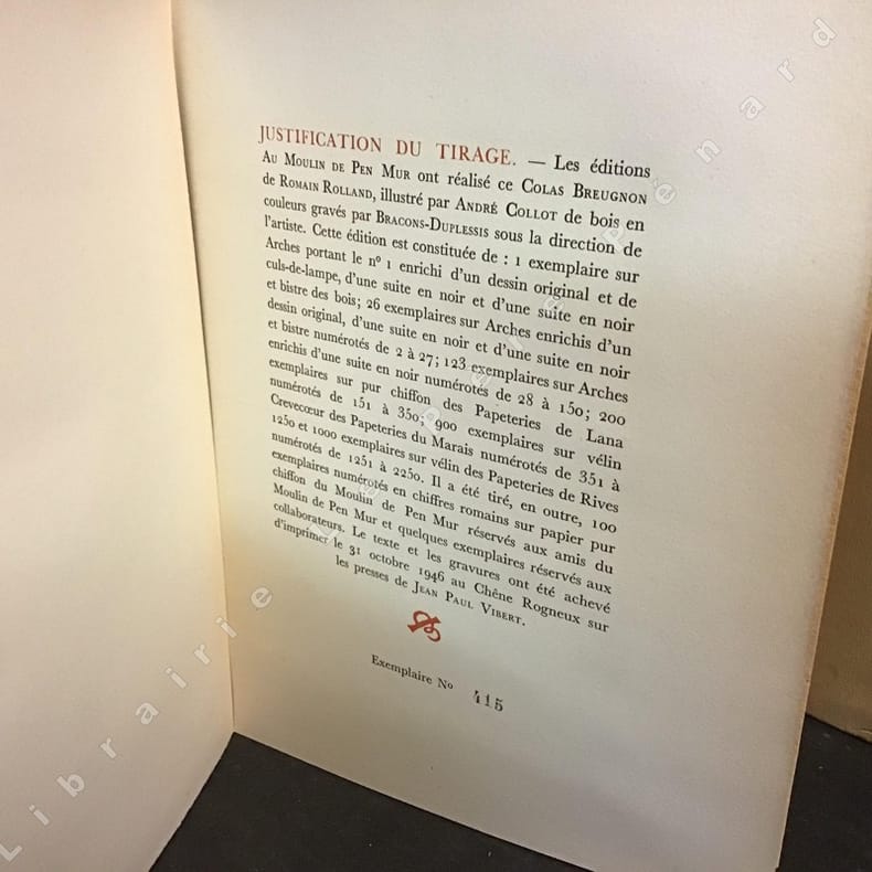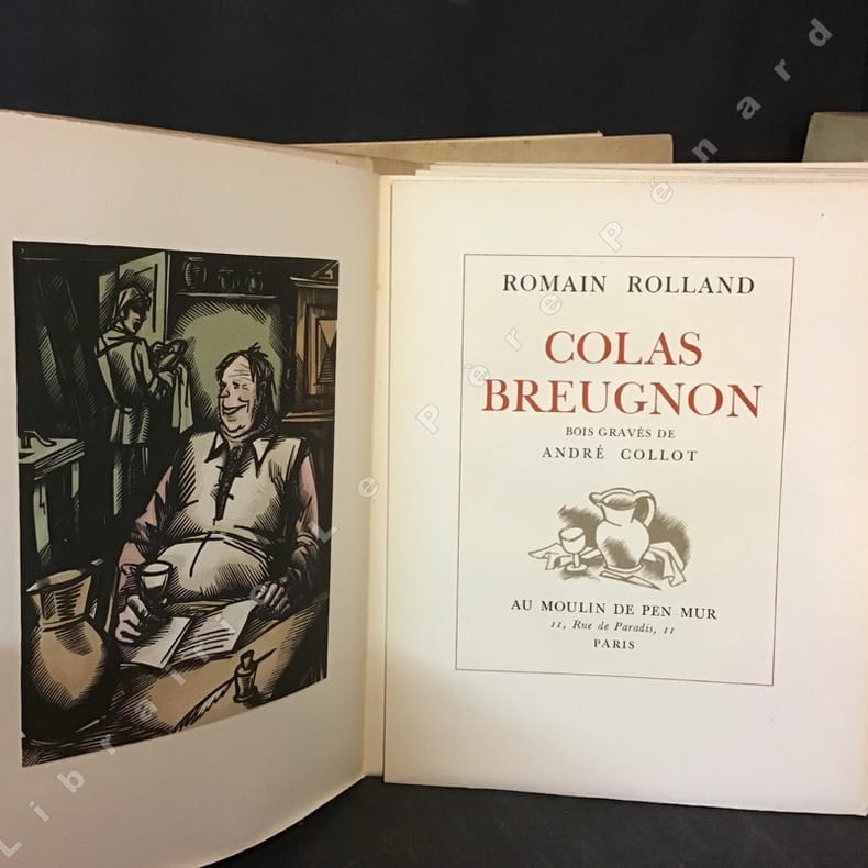 Couverture légèrmeent assombrie, sinon très bon état.Cette chronique villageoise, écrite par Romain Rolland avant la boucherie de la guerre de 14-18, est racontée à la première personne par Colas Breugnon, paysan bourguignon du XVIIe. Elle est un hymne à la vie et à une sagesse rustique et rabelaisienne. Publiée en 1918 chez Ollendorff (sous le titre "Colas Brugnon"), elle apparaîtra rétrospectivement, selon l'expression de Gorki, comme « un défi gaulois à la guerre » Libraire membre du S.L.A.M. (Syndicat national de la Librairie Ancienne et Moderne) et de la L.I.L.A. (Ligue Internationale de la Librairie Ancienne). N'hésitez pas à prendre contact par mail pour des photographies et des détails supplémentaires, pour des recherches ou des estimations de livres anciens et rares.