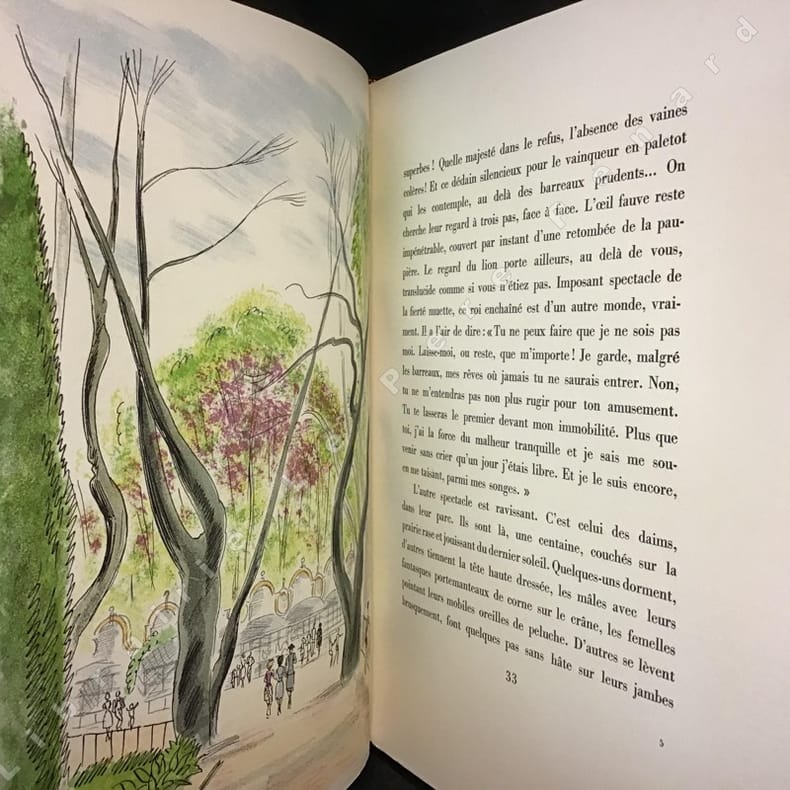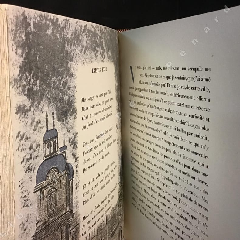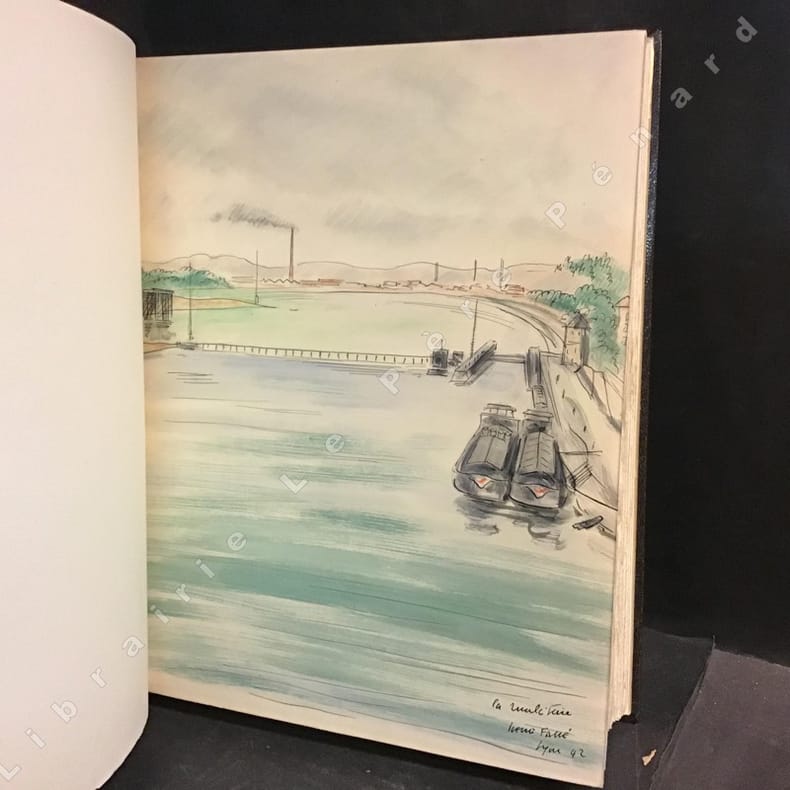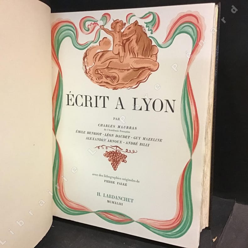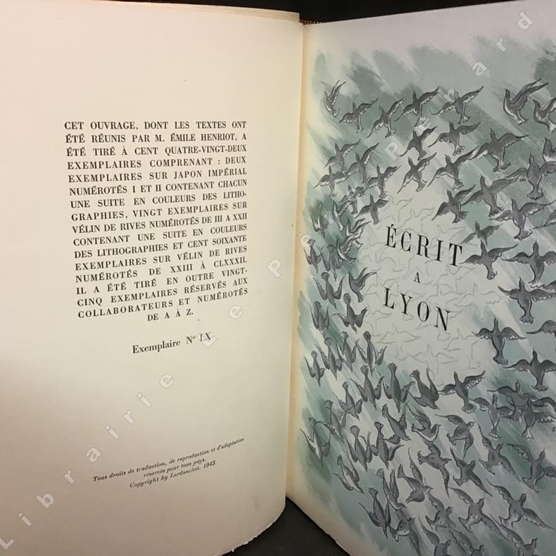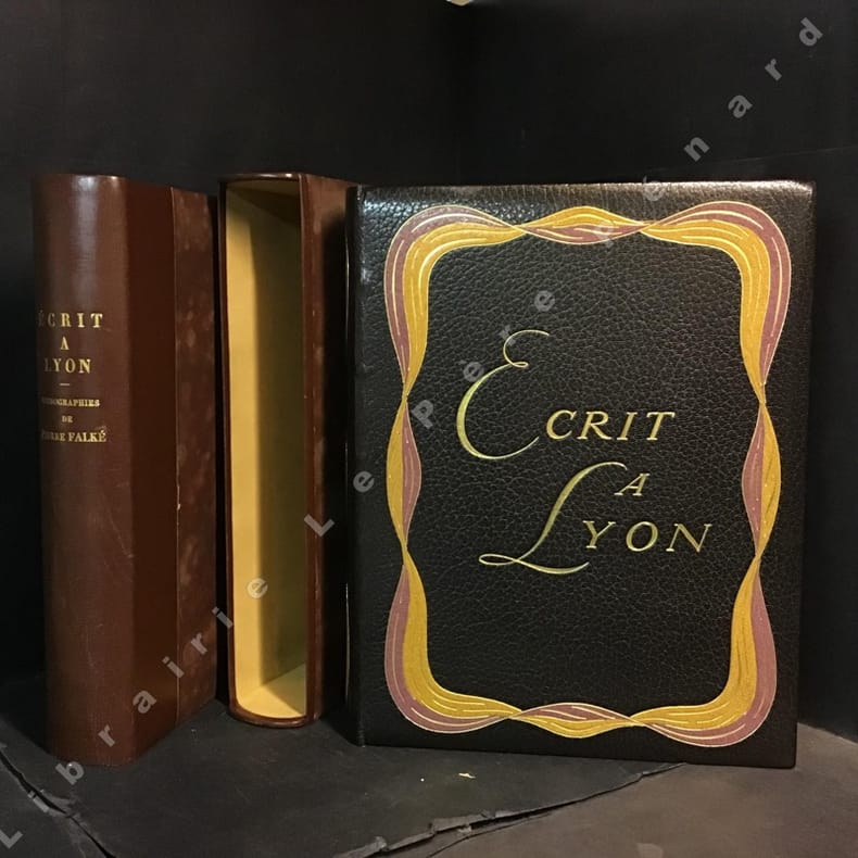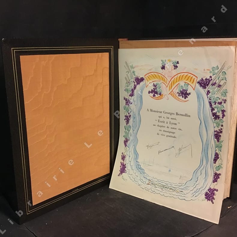 1943 H. Lardanchet - MCMXLIII (1943) - Un fort volume in-quatro (27x33,5cm), reliure plein maroquin, dos lisse, titre en doré sur le premier plat, décors en couleurs et dorés reprenant les décors de la couverture d'origine sur les plats et au dos, tranches dorées, filets dorés et toile marbrée sur les contreplats, toile marbrée sur les pages de gardes, reliure signée "E. & A. Maylander", avec son étui et sa chemise en cuir et papier marbré - 180 pages - Exemplaire nominatif de M. Georges Bernollin, avec justificatif - L'un des 160 exemplaires sur vélin de Rives, numéroté LX - AQUARELLE ORIGINALE SIGNÉE de Pierre Falké entre la page de faux titre et la page de grand titre - Très nombreuses lithographies en couleurs, in et hors-texte, dans l'ouvrage