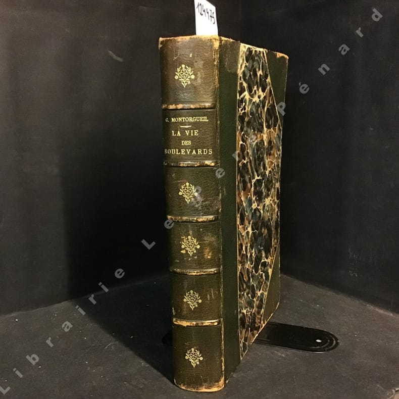 Edition originale illustrée de 200 dessins en couleurs de Pierre Vidal. Tirage limité à 700 exemplaires numérotés, N°294. Couvertures et dos illustrés conservés. Impression sur vélin teinté couché. Reliure à la Bradel en demi maroquin à coins chocolat moderne. Dos à 4 nerfs janséniste. Feuillet 49 caviardé en marge basse (un trou avec frottement du papier). Dos éclairci sur les 2 premiers caissons. Bon exemplaire. * Au travers de chapitres divers représentant la vie des boulevards, les grandes et petites boutiques, cochers et voitures, les cafés et restaurants, l'étranger au boulevard, les femmes du boulevard, les théâtres, les petites Cythères, la place de la République, le boulevard du crime, la Bastille, les badauds et touristes étrangers, les camelots et mauvais garçons, élégantes et matrones, caboulots et restaurants huppés, on retrouve dans le style de Montorgueil, les descriptions de Paris du temps des "Français peint par eux mêmes" et autres monographies romantiques sur Paris. - Photographies et détails sur www.Edition-Originale.com -