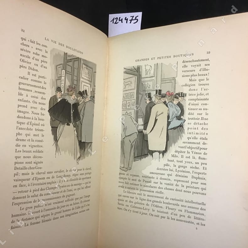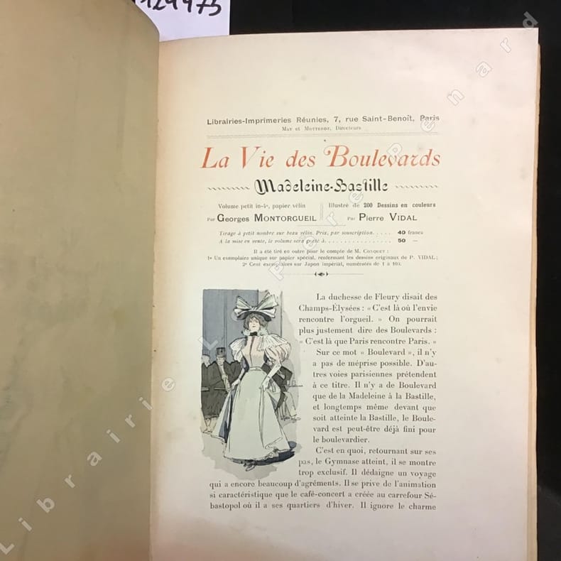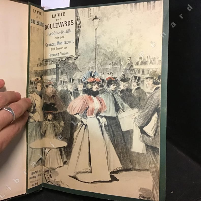 Édition originale tirée à 700 exemplaires. Beau livre sur le Paris de la fin du XIXe siècle, illustré de 200 compositions en couleurs de Pierre Vidal montrant ta Madeleine, les grandes et petites boutiques, cochers et voitures, les cafés et restaurants, l'étranger au boulevard, les femmes du boulevard, les théâtres, les petites Cythères, la place de la République, le boulevard du crime, la Bastille, les badauds et touristes étrangers, les camelots et mauvais garçons, élégantes et matrones, caboulots et restaurants huppés, etc.Bon exemplaire. Le relieur a conservé la couverture repliée en tête du volume.