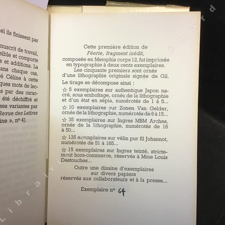 Editions du Fourneau 1979. In-12 en feuilles de 28 pages au format 18,5 x 12,5 cm. Couverture rempliée avec titre imprimé, sous cristal d'origine. Livre glissé sous coffret et chemise de protection. Fragment inédit de " Féerie pour une autre fois ", avec une lithographie en noir et un état en sépia, réalisée et signée par Gil. Un des 15 exemplaires strictement hors commerce, imprimés sur Ingres teinté, réservés à Mme Louis Destouches. Rarissime édition originale sutout dans un tel état de fraicheur et à la provenance idéale.