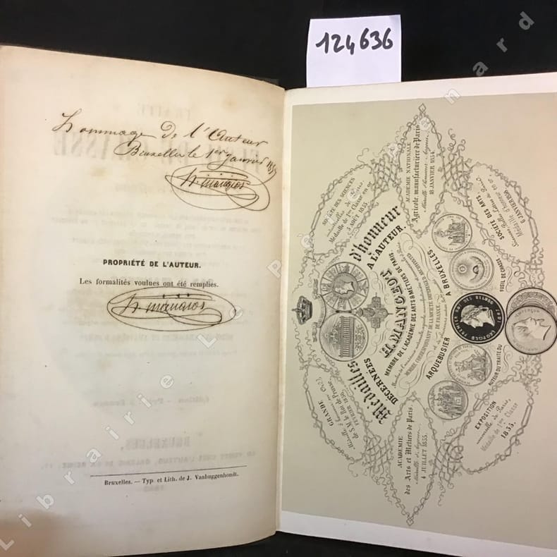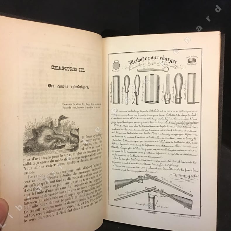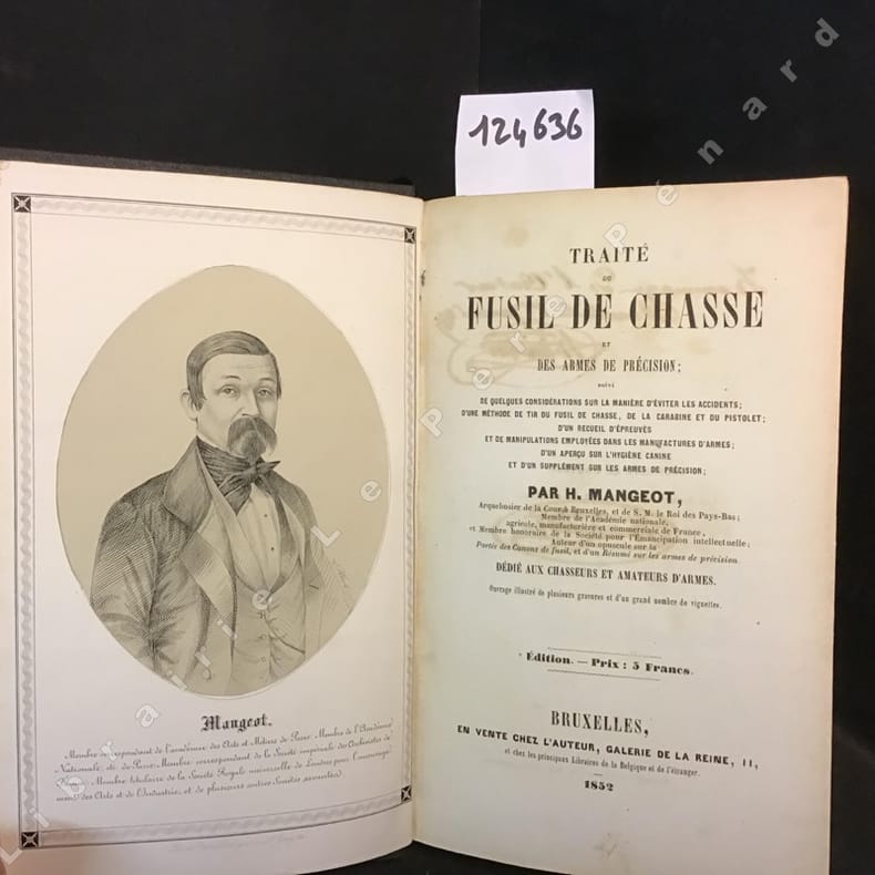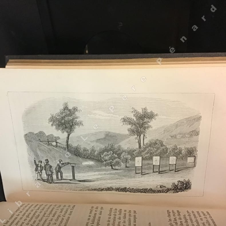 A Bruxelles, en vente chez l'auteur, Galerie de la Reine, 11 - 1852 ( Édition Originale) - 1 vol in-8 - Superbe reliure du temps en plein chagrin noir avec plats et dos richement ornés d'un décor de volutes en doré accompagné sur chaque plat d'un fer aux attributs de chasse ( Cor, fusil et sangler ), toutes tranches dorées - Ouvrage illustré de plusieurs gravures (planches hors texte) dont deux planches pliées en fin de volume et d'un grand nombre de vignettes - Portrait de Mangeot en frontispice - Avec un hommage et une certification manuscrits de l'auteur au dos de la page de titre. 347 pages