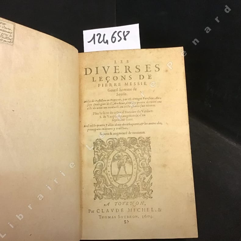 Tournon 1604 A Tournon par Claude Michel, & Thomas Soveron - 1604 - 1 Vol in-12 - Pleine basane verte olive, dos lisse avec filets et fleurons dorés, titre en doré ( reliure postérieure du XIXème siècle mais ancienne étiquette indiquant "relié par Derome Le Jeune" au revers de la première page de garde ) - Encadrement en doré sur chacun des plats, toutes tranches dorées ( probablement postérieurement) , roulettes sur l'intérieur des plats et armoiries du Comte H. De la Bedoyere sur le deuxième plat - 738